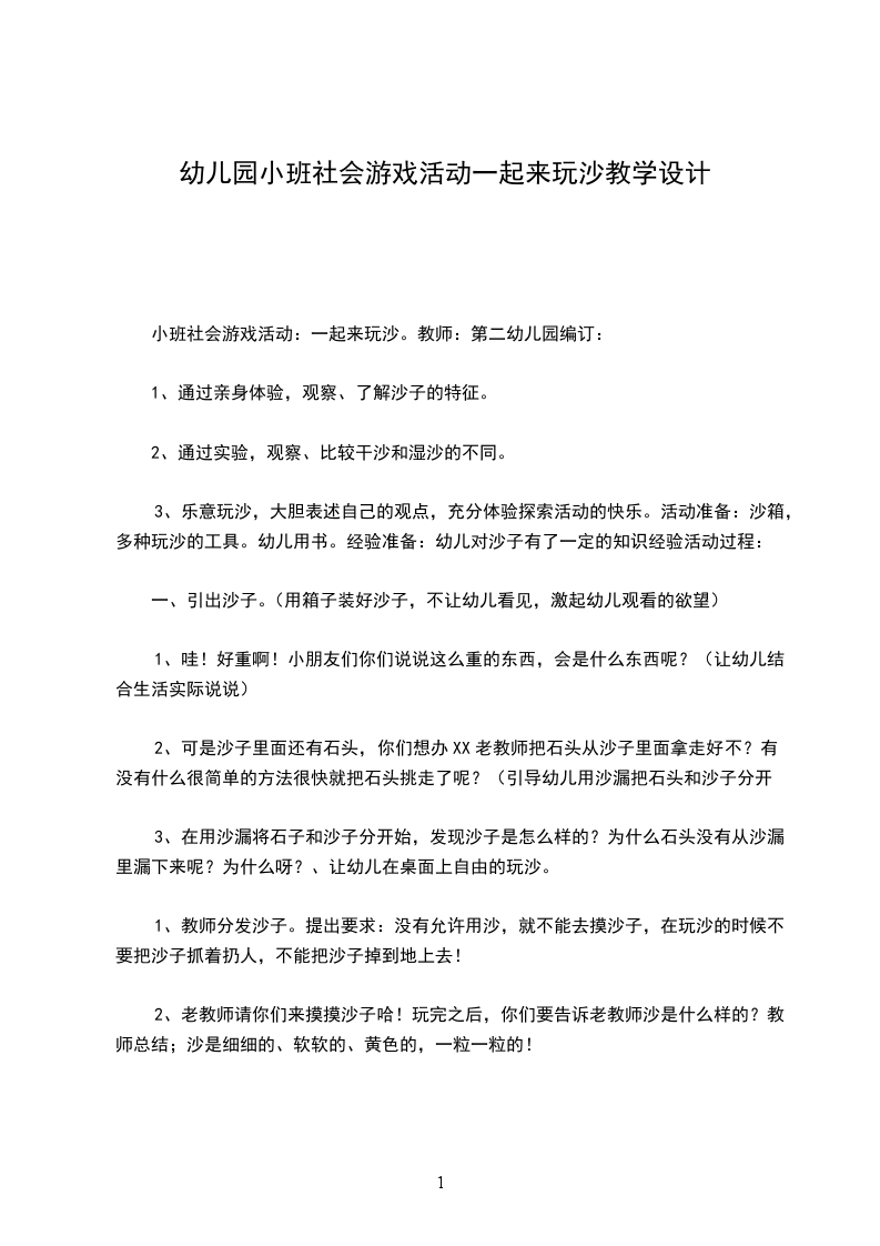 小班社会游戏活动:一起来玩沙。教师:第二幼儿园编订: