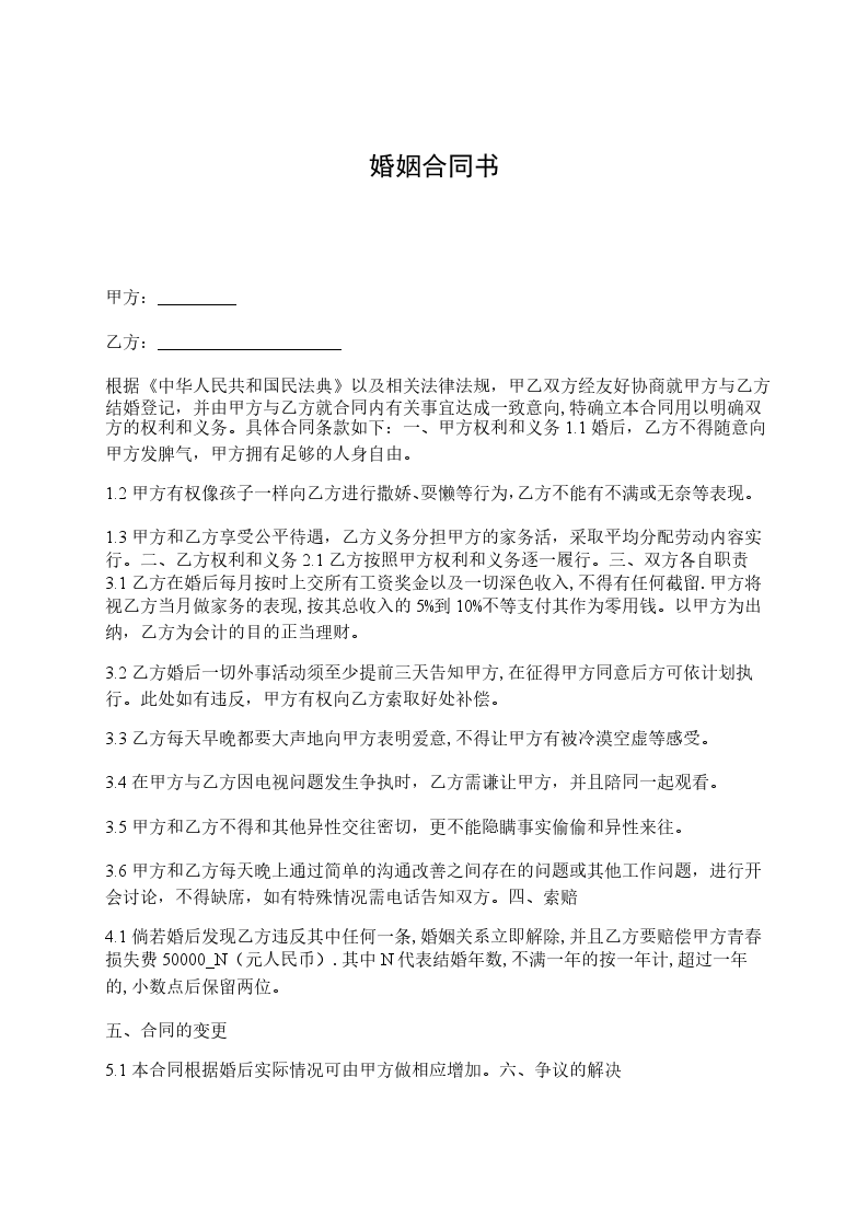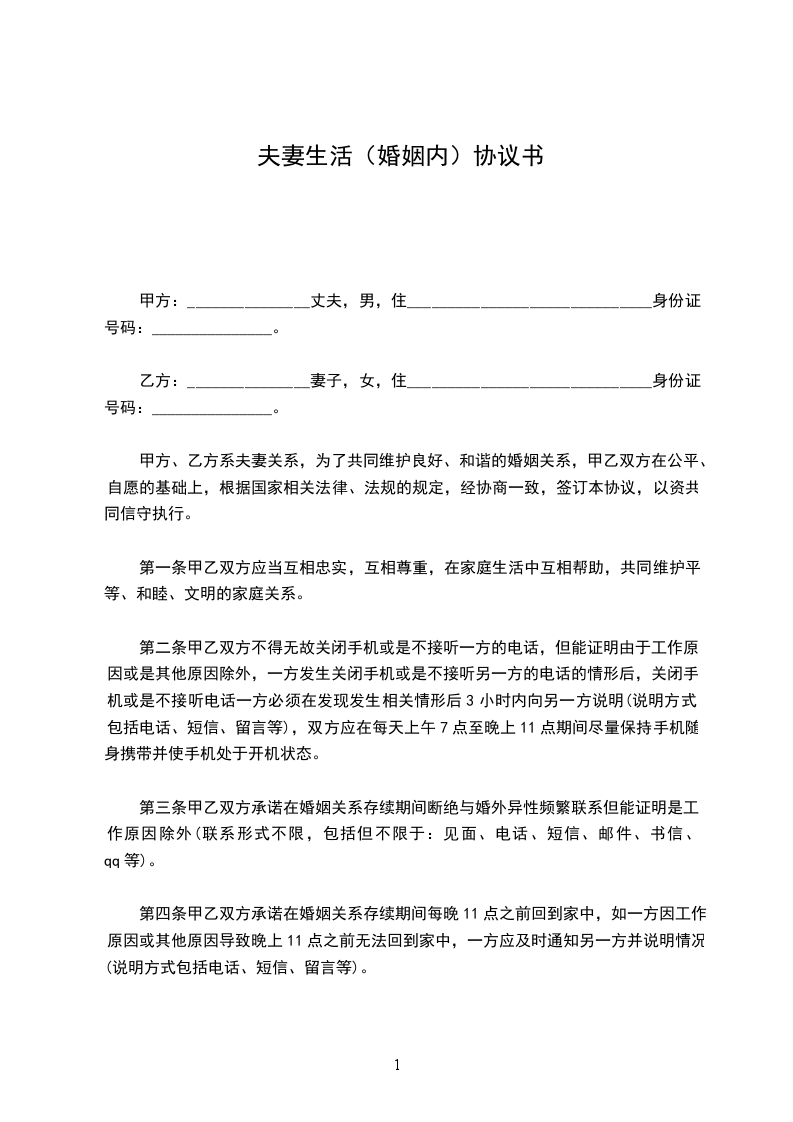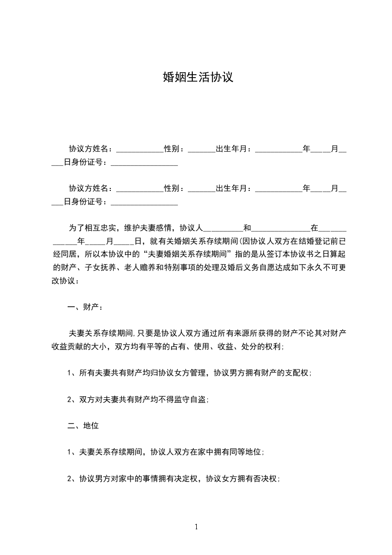 为了相互忠实,维护夫妻感情,协议人__________和_______________在_____________年_____月_____日,就有关婚姻关系存续期间(因协议人双方在结婚登记前已经同居,所以本协议中的“夫妻婚姻关系存续期间”指的是从签订本协议书之日算起)的财产、子女抚养、老人赡养和特别事项的处理及婚后义务自愿达成如下永久不可更改协议: