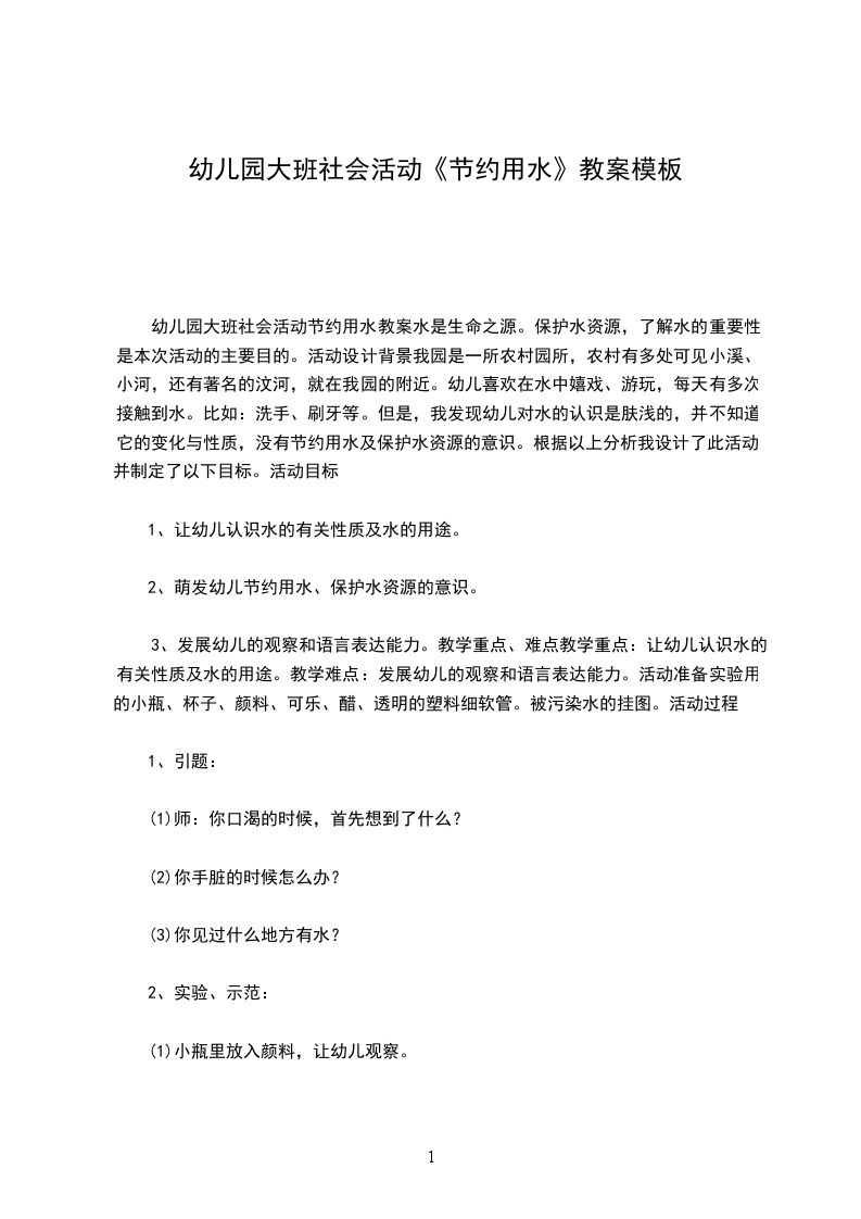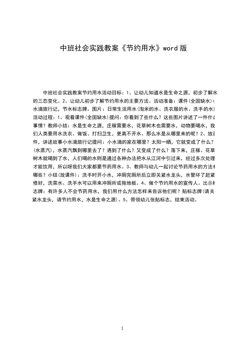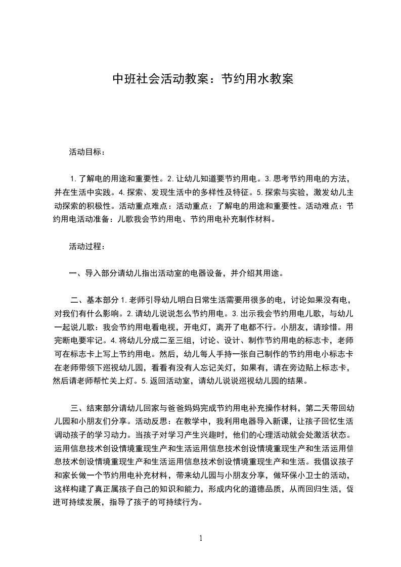 二、基本部分1.老师引导幼儿明白日常生活需要用很多的电,讨论如果没有电,对我们有什么影响。2.请幼儿说说怎么节约用电。3.出示我会节约用电儿歌,与幼儿一起说儿歌:我会节约用电看电视,开电灯,离开了电都不行。小朋友,请珍惜。用完断电要牢记。4.将幼儿分成二至三组,讨论、设计、制作节约用电的标志卡,老师可在标志卡上写上节约用电。然后,幼儿每人手持一张自己制作的节约用电小标志卡,在老师带领下巡视幼儿园,看看有没有人忘记关灯,如果有,请在旁边贴上标志卡,然后请老师帮忙关上灯。5.返回活动室,请幼儿说说巡视幼儿园的结果。