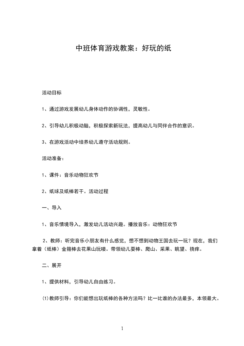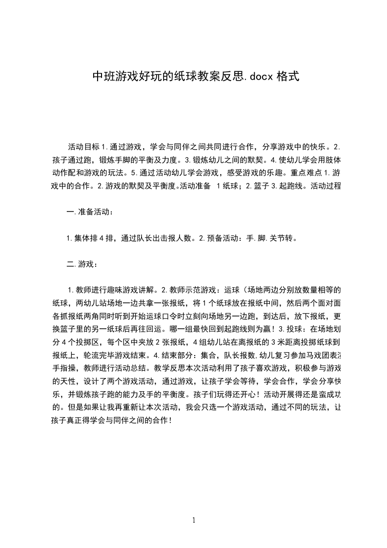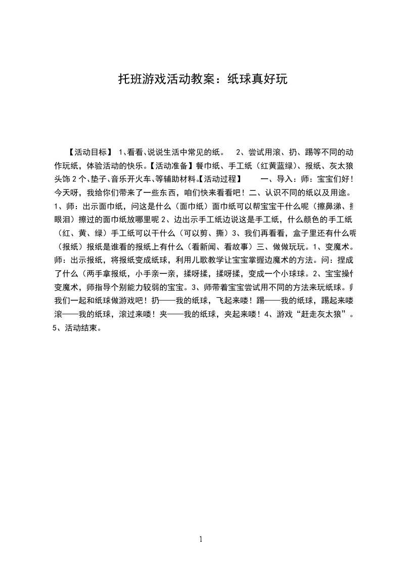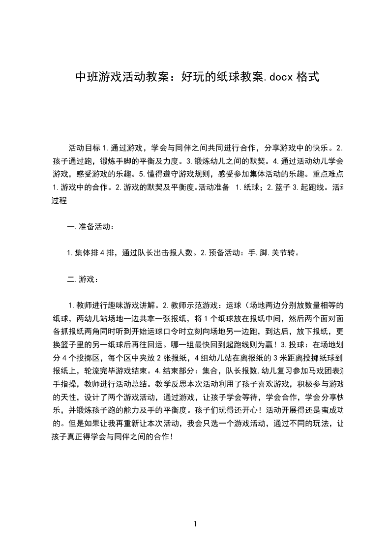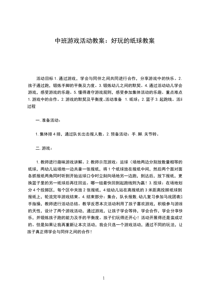 1.教师进行趣味游戏讲解。2.教师示范游戏:运球(场地两边分别放数量相等的纸球,两幼儿站场地一边共拿一张报纸,将1个纸球放在报纸中间,然后两个面对面各抓报纸两角同时听到开始运球口令时立刻向场地另一边跑,到达后,放下报纸,更换篮子里的另一纸球后再往回运。哪一组最快回到起跑线则为赢!3.投球:在场地划分4个投掷区,每个区中夹放2张报纸,4组幼儿站在离报纸的3米距离投掷纸球到报纸上,轮流完毕游戏结束。4.结束部分:集合,队长报数,幼儿复习参加马戏团表演手指操,教师进行活动总结。教学反思本次活动利用了孩子喜欢游戏,积极参与游戏的天性,设计了两个游戏活动,通过游戏,让孩子学会等待,学会合作,学会分享快乐,并锻炼孩子跑的能力及手的平衡度。孩子们玩得还开心!活动开展得还是蛮成功的。但是如果让我再重新让本次活动,我会只选一个游戏活动,通过不同的玩法,让孩子真正得学会与同伴之间的合作!