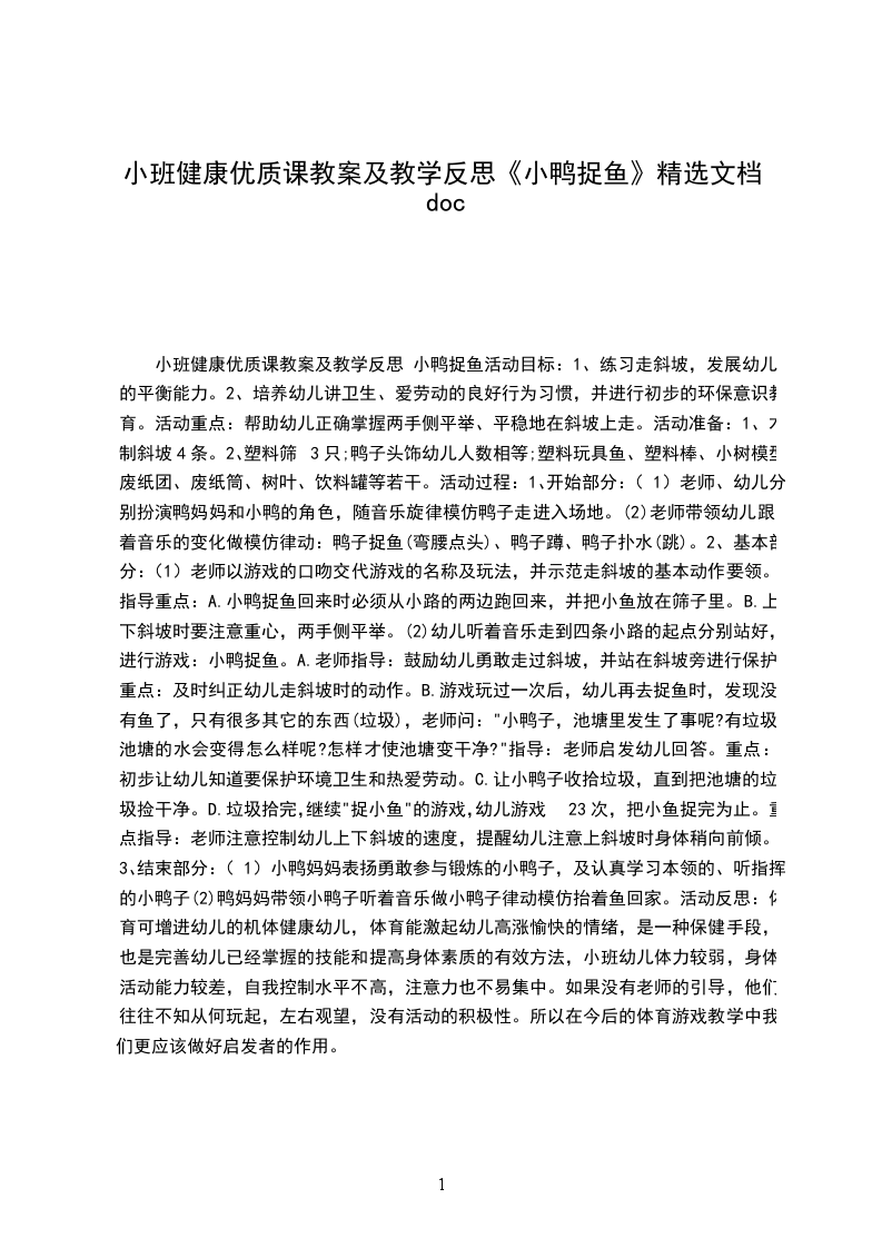 (2)鸭妈妈带领小鸭子听着音乐做小鸭子律动模仿抬着鱼回家。活动反思:体育可增进幼儿的机体健康幼儿,体育能激起幼儿高涨开心的心情,是一种保健手段,也是完善幼儿已经把握的技能和提高身体素养的有效方法,小班幼儿体力较弱,身体活动能力较差,自我掌握水平不高,留意力也不易集中。假如没有老师的引导,他们往往不知从何玩起,左右观望,没有活动的积极性。所以在今后的体育游玩教学中我们更应当做好启发者的作用。