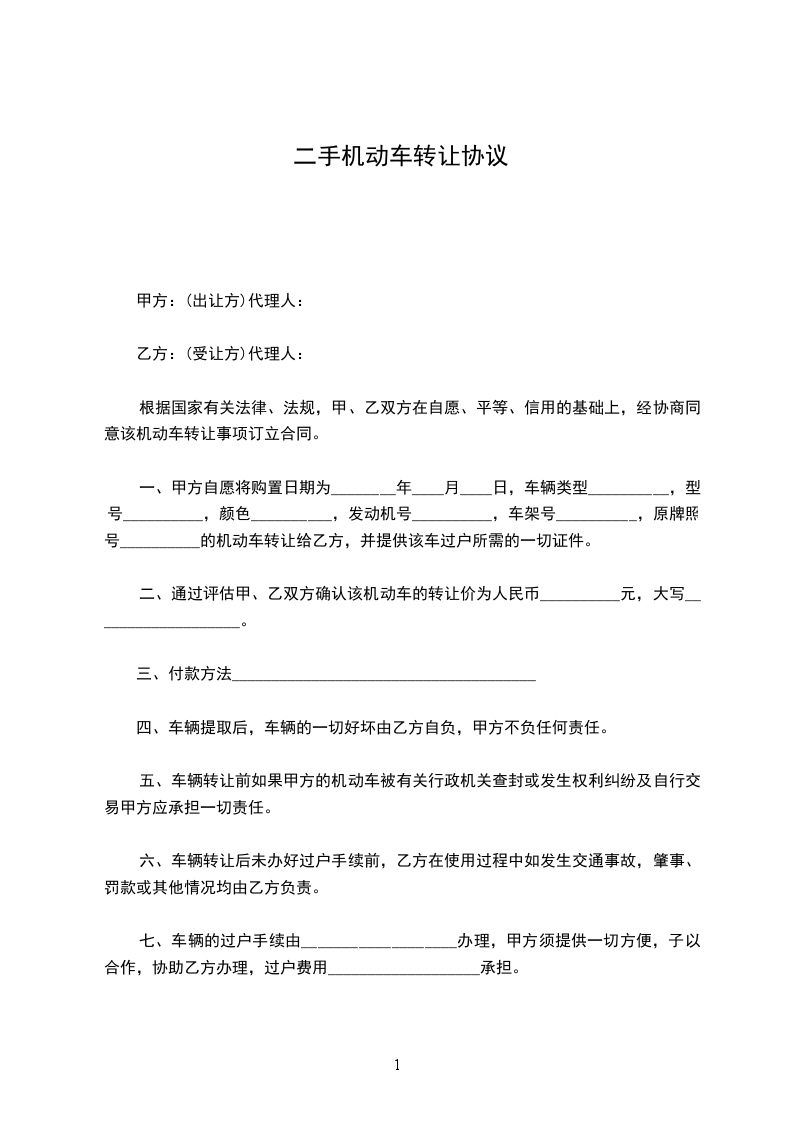 一、甲方自愿将购置日期为________年____月____日,车辆类型__________,型号__________,颜色__________,发动机号__________,车架号__________,原牌照号__________的机动车转让给乙方,并提供该车过户所需的一切证件。