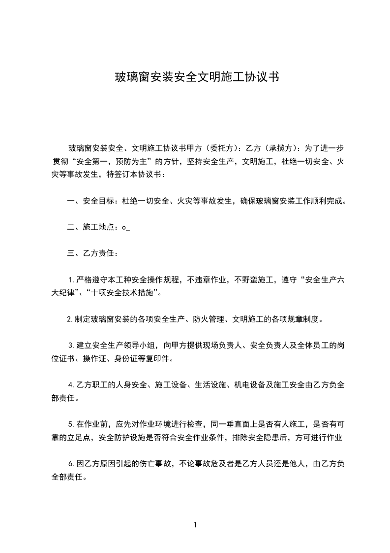 玻璃窗安装安全、文明施工协议书甲方(委托方):乙方(承揽方):为了进一步贯彻“安全第一,预防为主”的方针,坚持安全生产,文明施工,杜绝一切安全、火灾等事故发生,特签订本协议书: