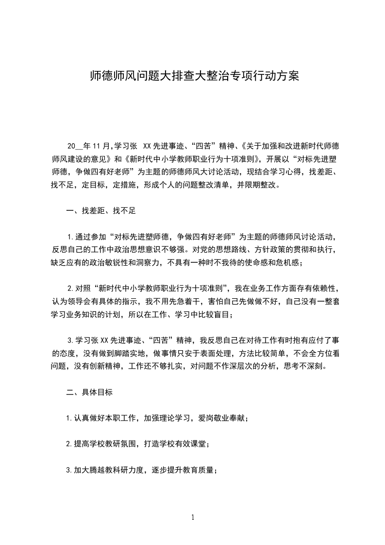 20__年11月,学习张XX先进事迹、“四苦”精神、《关于加强和改进新时代师德师风建设的意见》和《新时代中小学教师职业行为十项准则》,开展以“对标先进塑师德,争做四有好老师”为主题的师德师风大讨论活动,现结合学习心得,找差距、找不足,定目标,定措施,形成个人的问题整改清单,并限期整改。