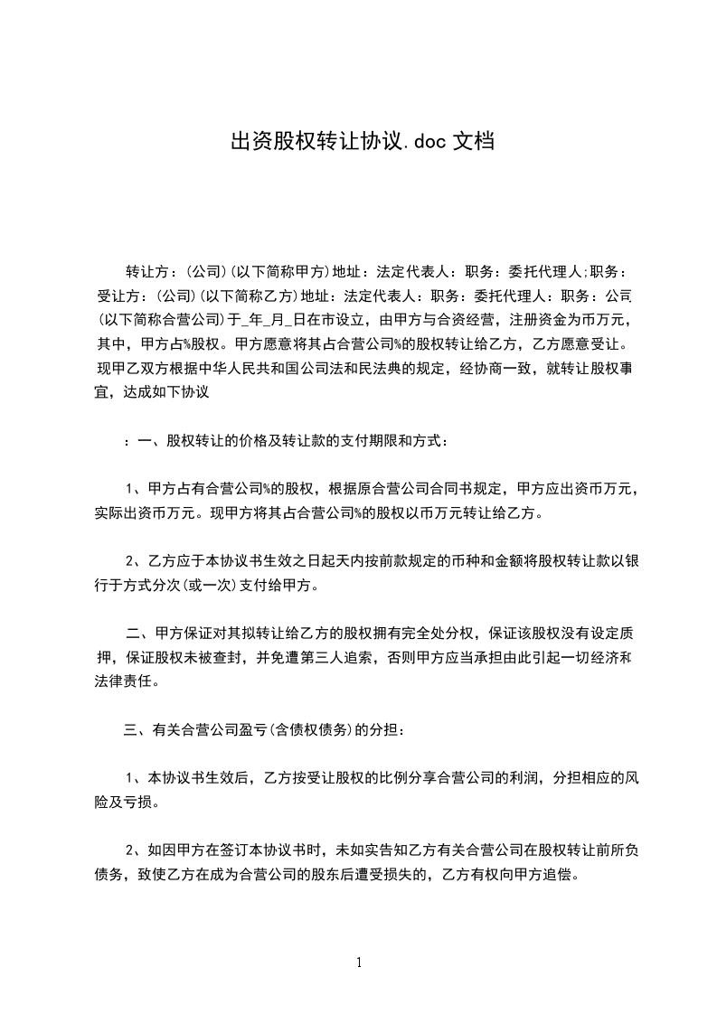 转让方:(公司)(以下简称甲方)地址:法定代表人:职务:委托代理人;职务:受让方:(公司)(以下简称乙方)地址:法定代表人:职务:委托代理人:职务:公司(以下简称合营公司)于_年_月_日在市设立,由甲方与合资经营,注册资金为币万元,其中,甲方占%股权。甲方愿意将其占合营公司%的股权转让给乙方,乙方愿意受让。现甲乙双方根据中华人民共和国公司法和民法典的规定,经协商一致,就转让股权事宜,达成如下协议