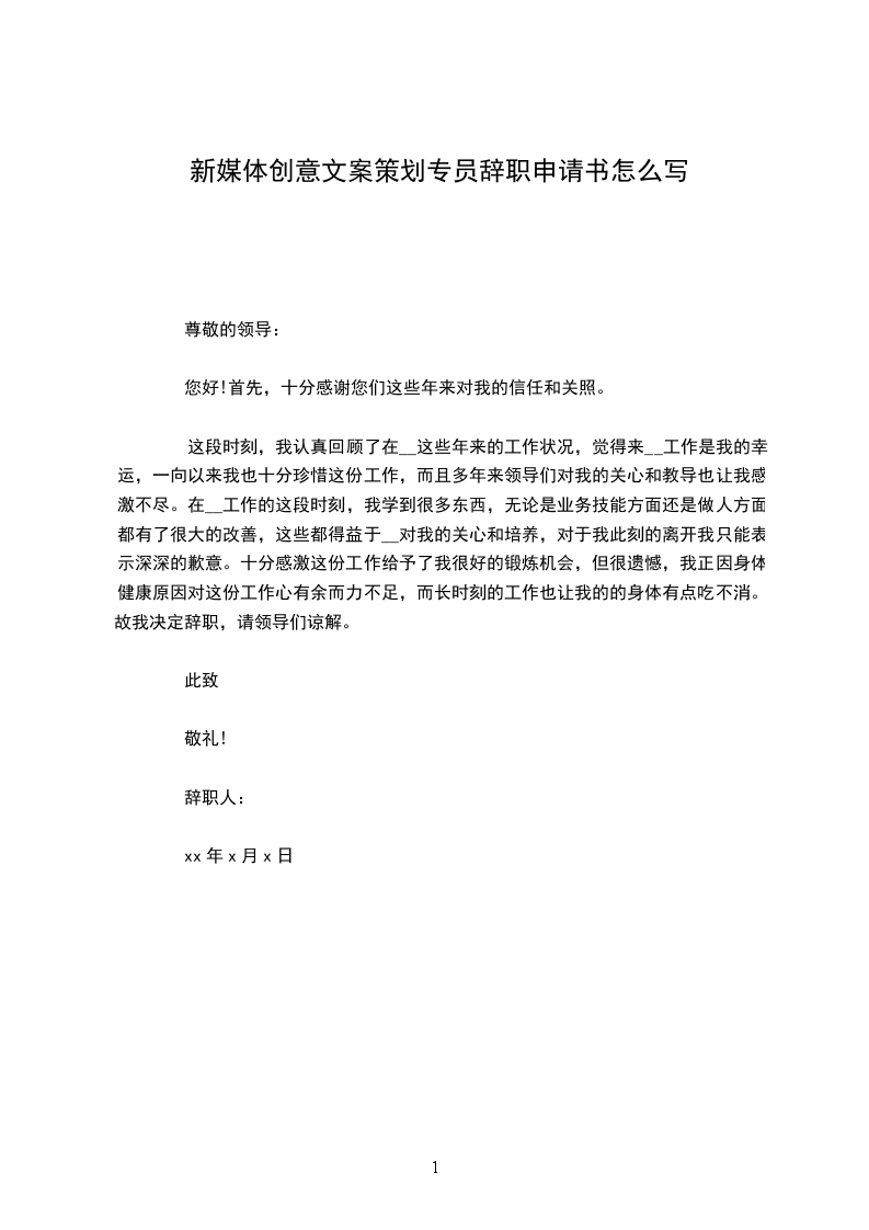 这段时刻,我认真回顾了在__这些年来的工作状况,觉得来__工作是我的幸运,一向以来我也十分珍惜这份工作,而且多年来领导们对我的关心和教导也让我感激不尽。在__工作的这段时刻,我学到很多东西,无论是业务技能方面还是做人方面都有了很大的改善,这些都得益于__对我的关心和培养,对于我此刻的离开我只能表示深深的歉意。十分感激这份工作给予了我很好的锻炼机会,但很遗憾,我正因身体健康原因对这份工作心有余而力不足,而长时刻的工作也让我的的身体有点吃不消。故我决定辞职,请领导们谅解。