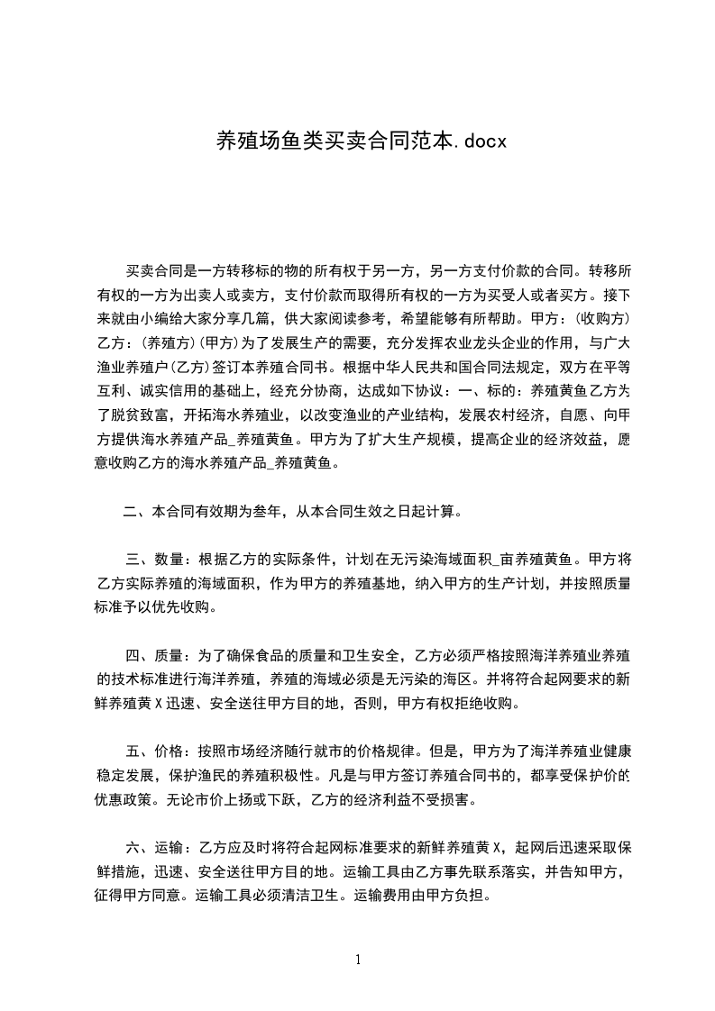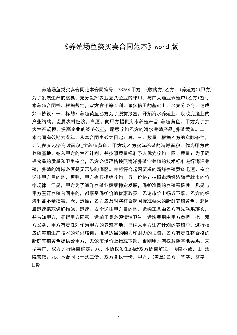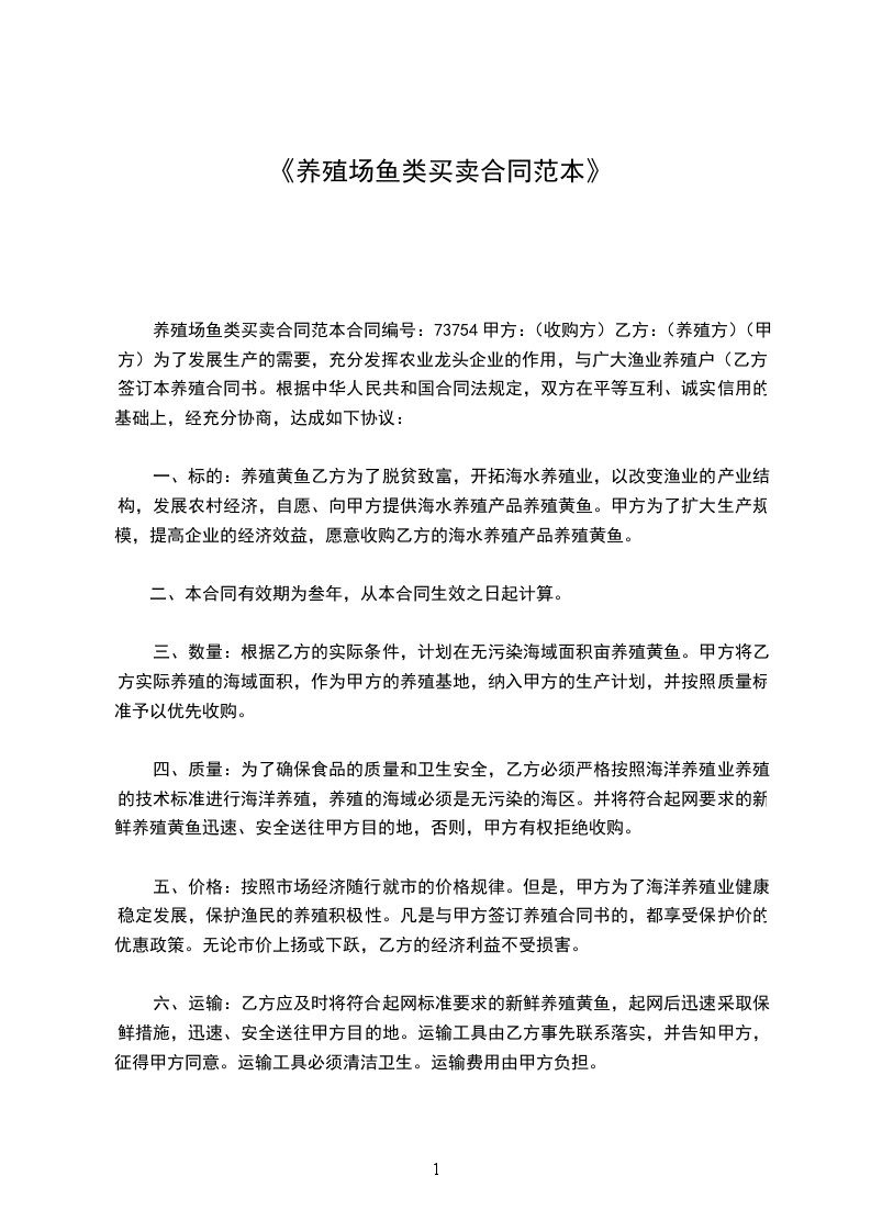 一、标的:养殖黄鱼乙方为了脱贫致富,开拓海水养殖业,以改变渔业的产业结构,发展农村经济,自愿、向甲方提供海水养殖产品_养殖黄鱼。甲方为了扩大生产规模,提高企业的经济效益,愿意收购乙方的海水养殖产品_养殖黄鱼。