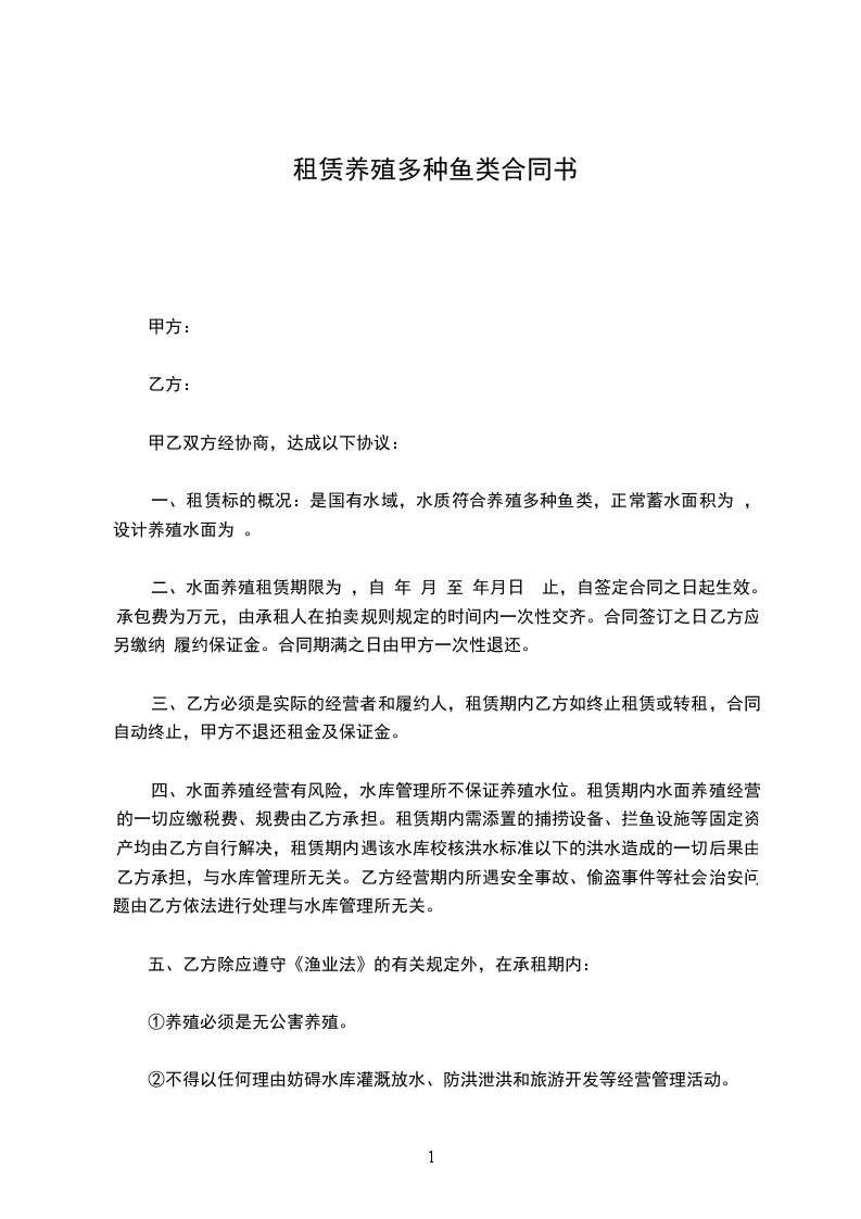 甲方:(收购方)乙方:(养殖方)(甲方)为了发展生产的需要,充分发挥农业龙头企业的作用,与广大渔业养殖户(乙方)签订本养殖合同书。根据民法典规定,双方在平等互利、诚实信用的基础上,经充分协商,达成如下协议:
