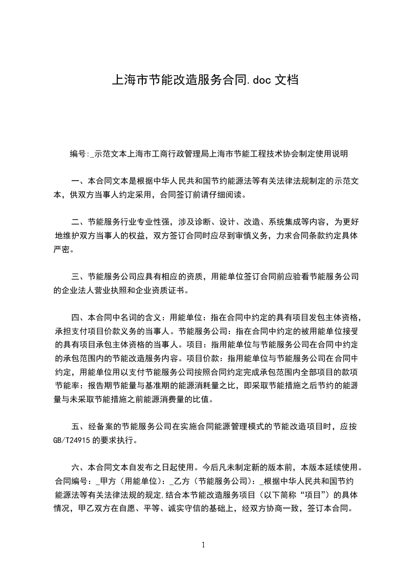 六、本合同文本自发布之日起使用。今后凡未制定新的版本前,本版本延续使用。合同编号:_甲方(用能单位):_乙方(节能服务公司):_根据中华人民共和国节约能源法等有关法律法规的规定,结合本节能改造服务项目(以下简称“项目”)的具体情况,甲乙双方在自愿、平等、诚实守信的基础上,经双方协商一致,签订本合同。