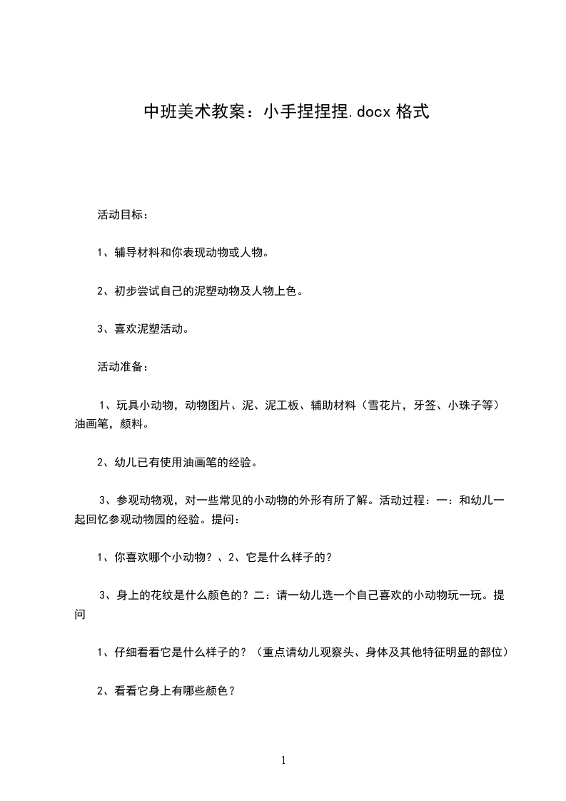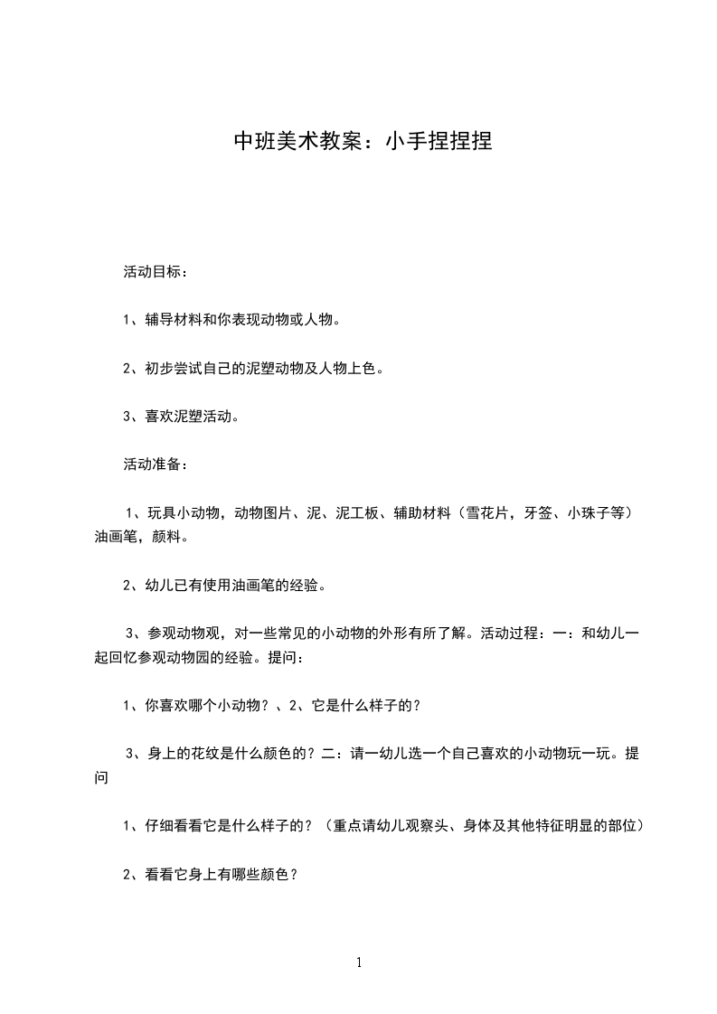 教学目标:认识与了解动物的基本特征。用橡皮泥抓住动物的特征做自己喜欢的动物,进一步掌握做泥塑过程中捏、粘、卷、揉、搓、揉等技能,培养学生的立体造型能力。激发学生爱护动物的情感与团结合作的精神。教学重点:用橡皮泥做自己喜欢的动物。教学难点:动物的特征教学过程: