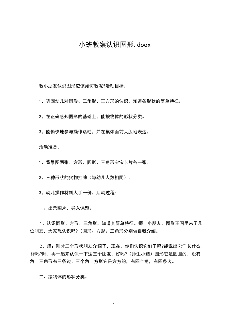 (二)、出示图片,提问:老师:你们看,老师把房顶盖成什么形状的?小朋友:三角形老师:房身呢?小朋友:正方形老师:门又是什么形状呢?小朋友:圆形引导幼儿说出三角形、正方形和圆形。