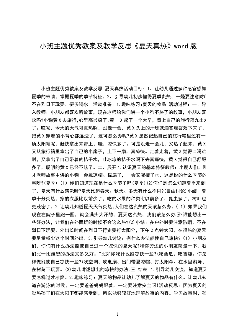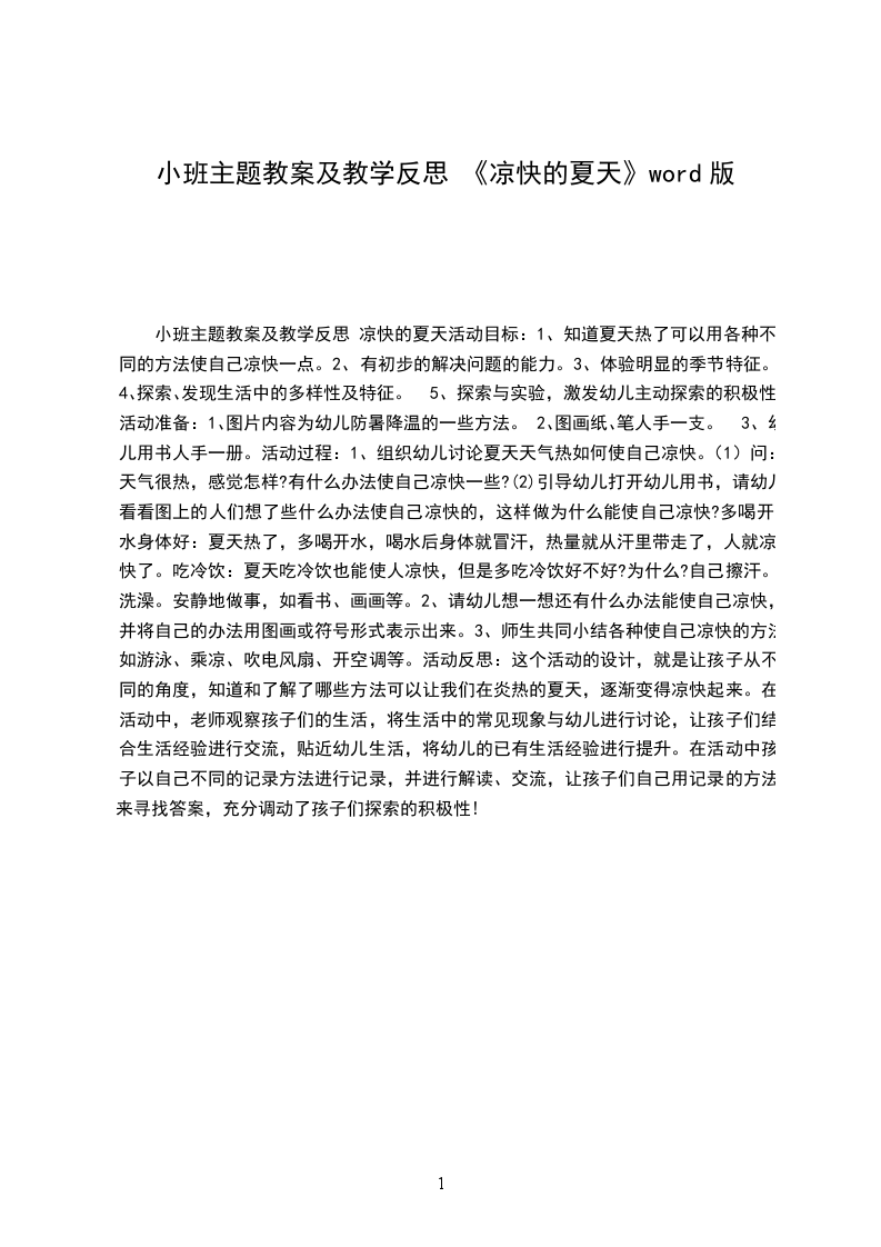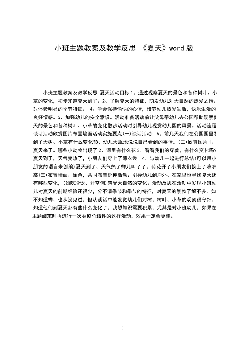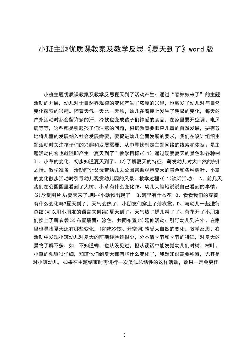 (4)延伸活动:引导幼儿到户外、在家里也寻找夏天还有哪些变化,(如吃冷饮、开空调)感受大自然的变化。教学反思:在活动中发现小班幼儿对夏天的前期经验还很少,分不清季节和季节的特征,对夏天的景物了解不多,如:不知道蝉,也从没见过,但从谈话中能发觉幼儿们对树、树叶、小草的观察很仔细,知道他们到夏天都有些什么变化了,我想知识需要积累,尤其是对小班幼儿,如果在主题结束时再进行一次类似总结性的这样活动,效果一定会更佳。