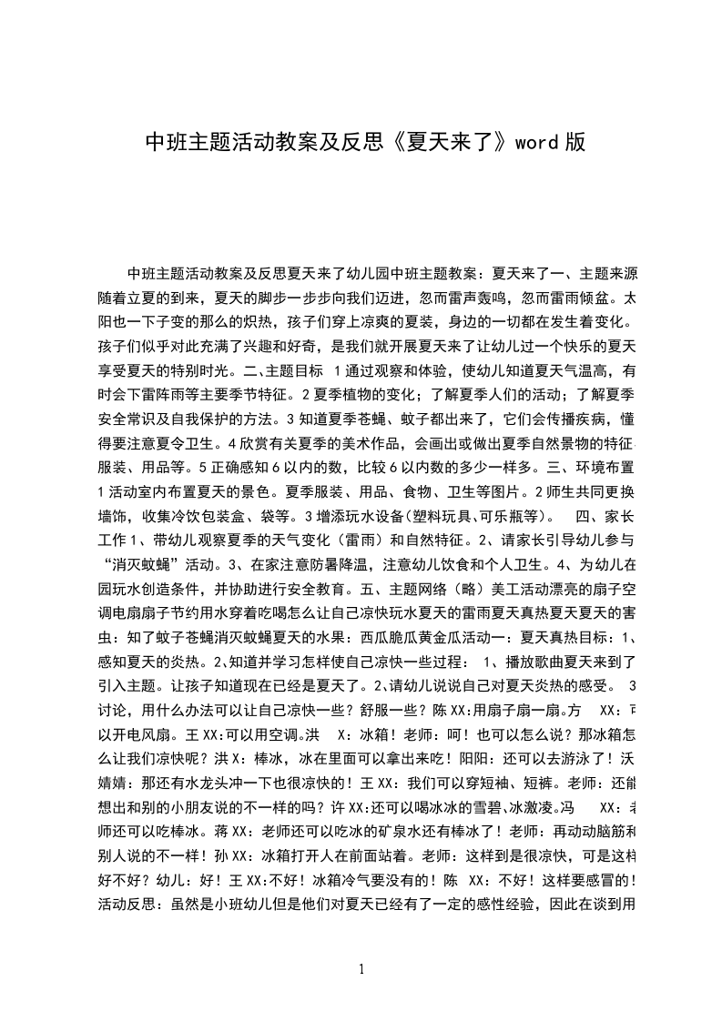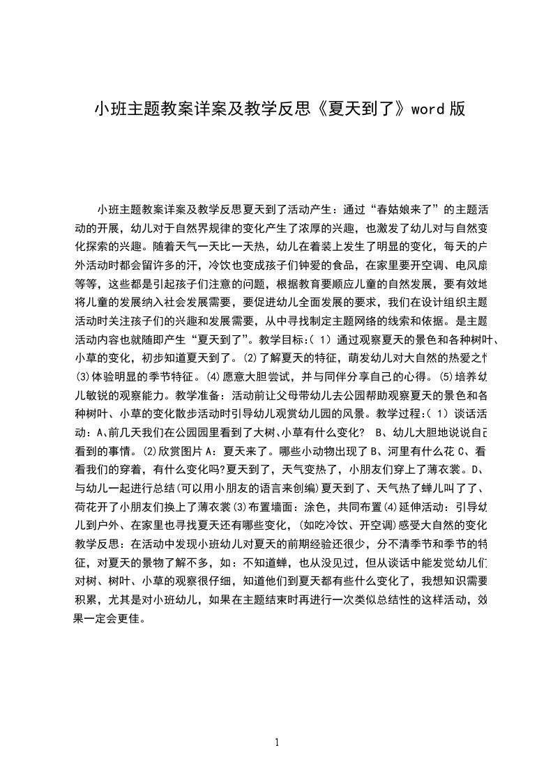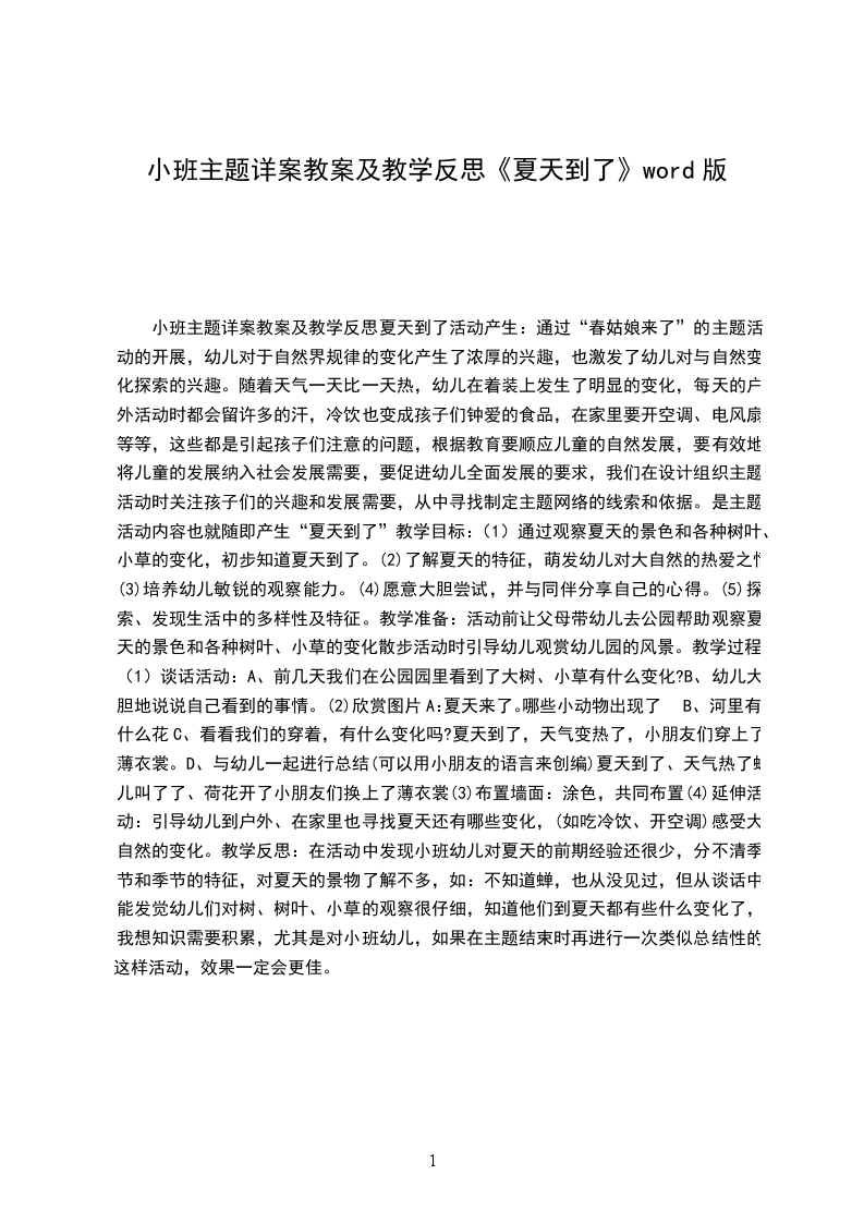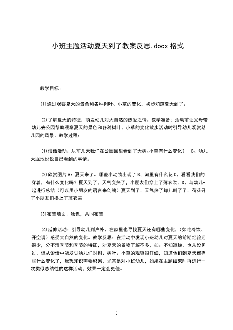 (2)了解夏天的特征,萌发幼儿对大自然的热爱之情。教学准备:活动前让父母带幼儿去公园帮助观察夏天的景色和各种树叶、小草的变化散步活动时引导幼儿观赏幼儿园的风景。教学过程: