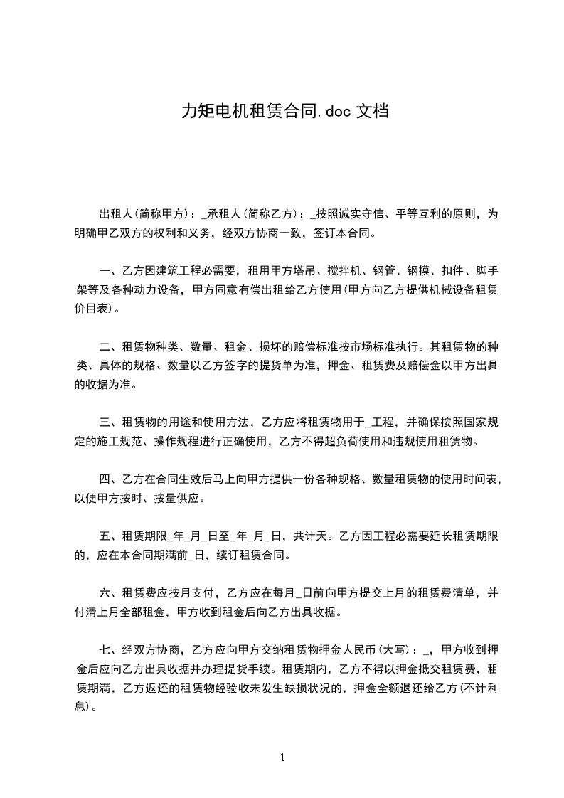 一、乙方因建筑工程必需要,租用甲方塔吊、搅拌机、钢管、钢模、扣件、脚手架等及各种动力设备,甲方同意有偿出租给乙方使用(甲方向乙方提供机械设备租赁价目表)。
