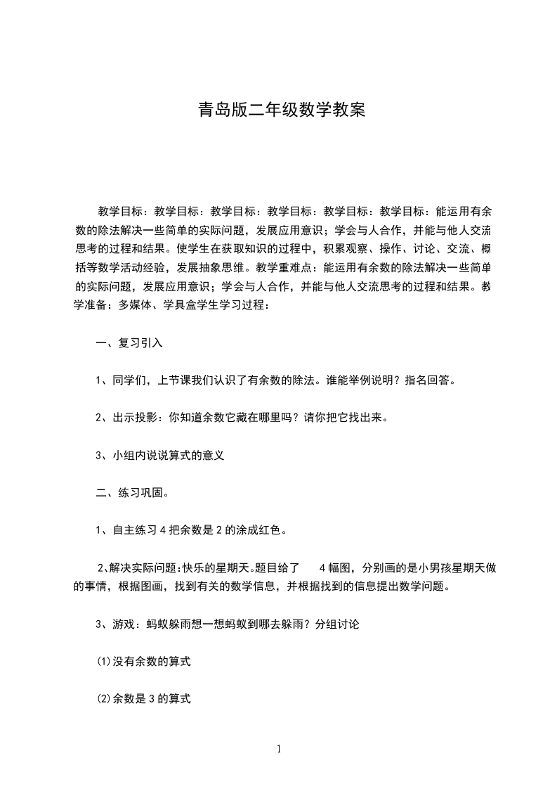 教学目标:教学目标:教学目标:教学目标:教学目标:教学目标:能运用有余数的除法解决一些简单的实际问题,发展应用意识;学会与人合作,并能与他人交流思考的过程和结果。使学生在获取知识的过程中,积累观察、操作、讨论、交流、概括等数学活动经验,发展抽象思维。教学重难点:能运用有余数的除法解决一些简单的实际问题,发展应用意识;学会与人合作,并能与他人交流思考的过程和结果。教学准备:多媒体、学具盒学生学习过程: