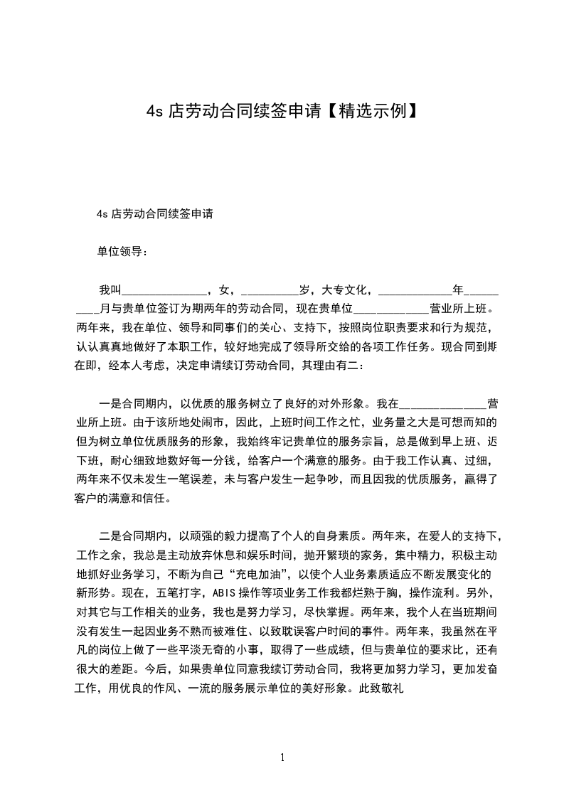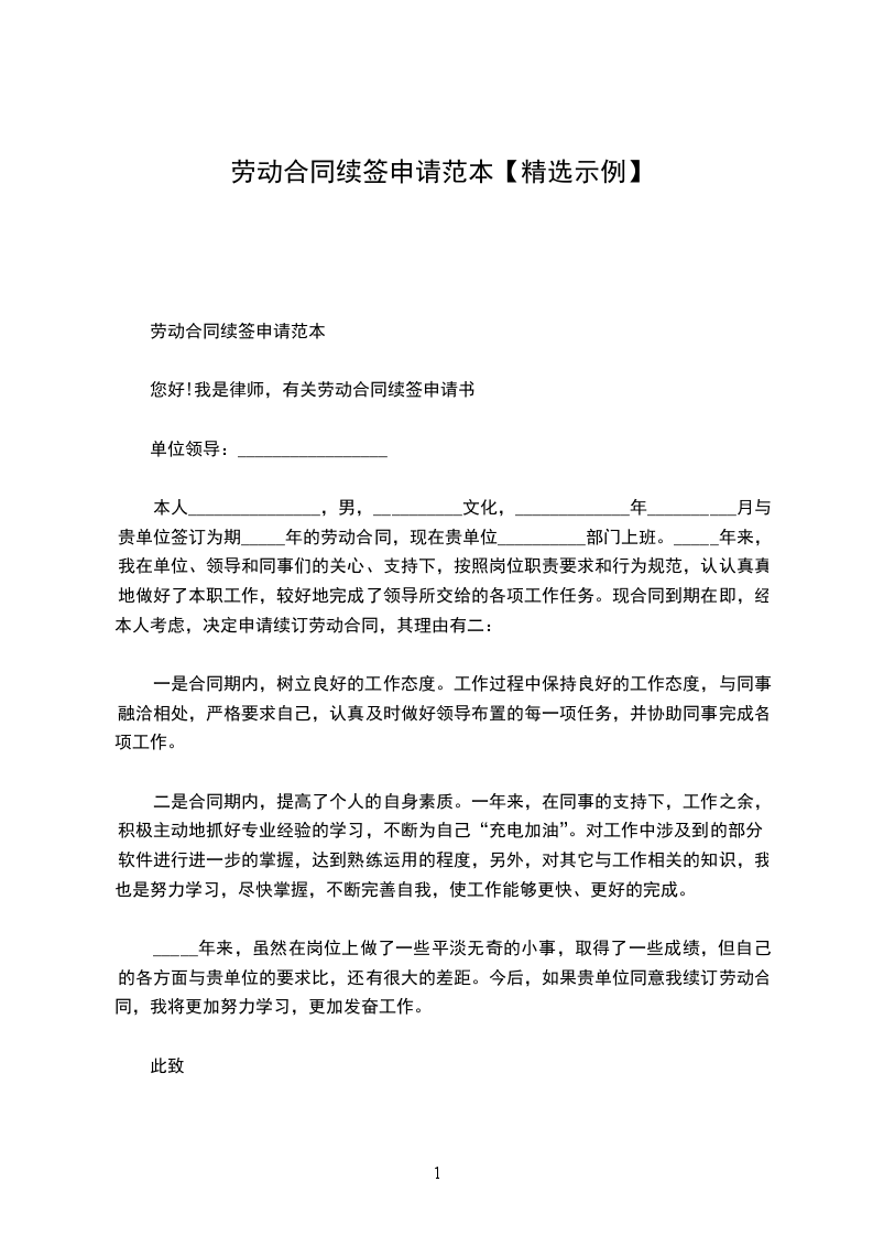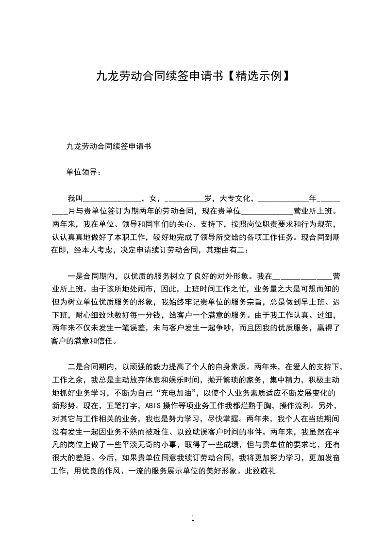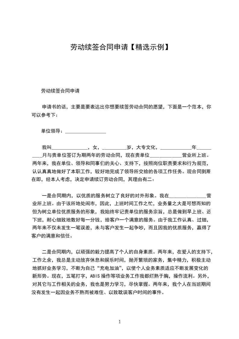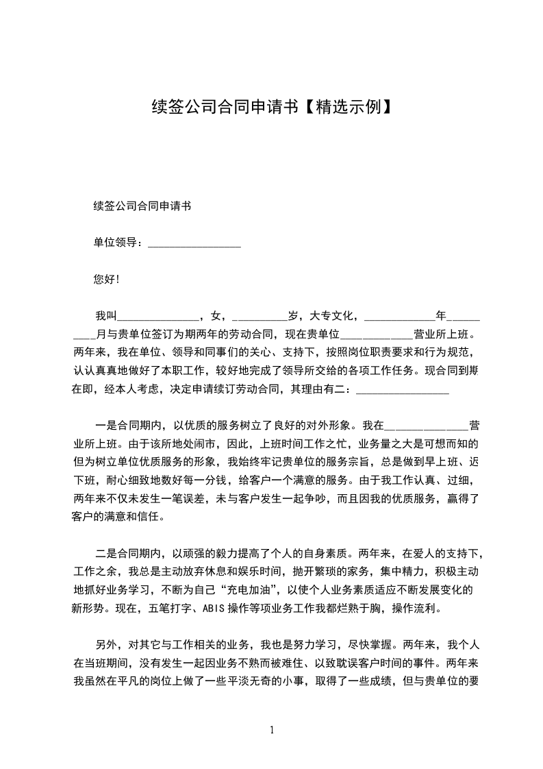 我叫_______________,女,__________岁,大专文化,_____________年__________月与贵单位签订为期两年的劳动合同,现在贵单位_____________营业所上班。两年来,我在单位、领导和同事们的关心、支持下,按照岗位职责要求和行为规范,认认真真地做好了本职工作,较好地完成了领导所交给的各项工作任务。现合同到期在即,经本人考虑,决定申请续订劳动合同,其理由有二:一是合同期内,以优质的服务树立了良好的对外形象。我在_______________营业所上班。由于该所地处闹市,因此,上班时间工作之忙,业务量之大是可想而知的。但为树立单位优质服务的形象,我始终牢记贵单位的服务宗旨,总是做到早上班、迟下班,耐心细致地数好每一分钱,给客户一个满意的服务。由于我工作认真、过细,两年来不仅未发生一笔误差,未与客户发生一起争吵,而且因我的优质服务,赢得了客户的满意和信任。二是合同期内,以顽强的毅力提高了个人的自身素质。两年来,在爱人的支持下,工作之余,我总是主动放弃休息和娱乐时间,抛开繁琐的家务,集中精力,积极主动地抓好业务学习,不断为自己“充电加油”,以使个人业务素质适应不断发展变化的新形势。现在,五笔打字,ABIS操作等项业务工作我都烂熟于胸,操作流利。另外,对其它与工作相关的业务,我也是努力学习,尽快掌握。两年来,我个人在当班期间,没有发生一起因业务不熟而被难住、以致耽误客户时间的事件。两年来,我虽然在平凡的岗位上做了一些平淡无奇的小事,取得了一些成绩,但与贵单位的要求比,还有很大的差距。今后,如果贵单位同意我续订劳动合同,我将更加努力学习,更加发奋工作,用优良的作风、一流的服务展示单位的美好形象。此致敬礼