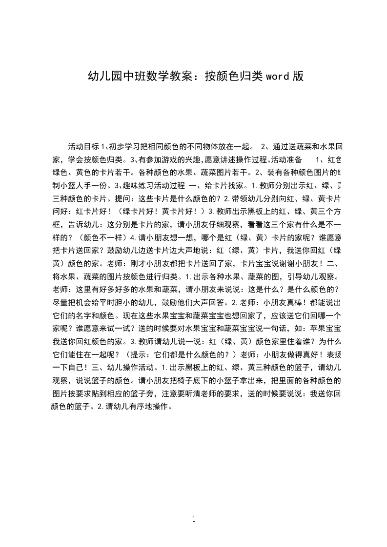 二、将水果、蔬菜的图片按颜色进行归类。1.出示各种水果、蔬菜的图,引导幼儿观察。老师:这里有好多好多的水果和蔬菜,请小朋友来说说:这是什么?是什么颜色的?尽量把机会给平时胆小的幼儿,鼓励他们大声回答。2.老师:小朋友真棒!都能说出它们的名字和颜色。现在这些水果宝宝和蔬菜宝宝也想回家了,应该送它们回哪一个家呢?谁愿意来试一试?送的时候要对水果宝宝和蔬菜宝宝说一句话,如:苹果宝宝,我送你回红颜色的家。3.教师请幼儿说一说:红(绿、黄)颜色家里住着谁?为什么它们能住在一起呢?(提示:它们都是什么颜色的?)老师:小朋友做得真好!表扬一下自己!