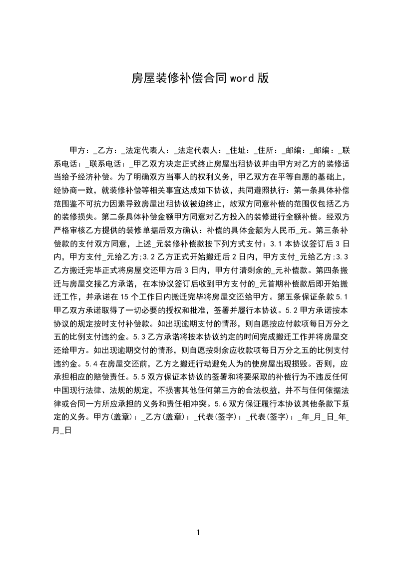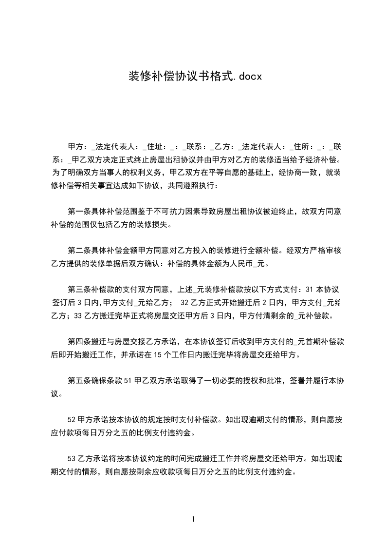 甲方:法定代表人:住址:邮编:联系电话:乙方:法定代表人:住所:邮编:联系电话:甲乙双方决定正式终止房屋出租协议并由甲方对乙方的装修适当给予经济补偿。为了明确双方当事人的权利义务,甲乙双方在平等自愿的基础上,经协商一致,就装修补偿等相关事宜达成如下协议,共同遵照执行:第一条具体补偿范围鉴于不可抗力因素导致房屋出租协议被迫终止,故双方同意补偿的范围仅包括乙方的装修损失。