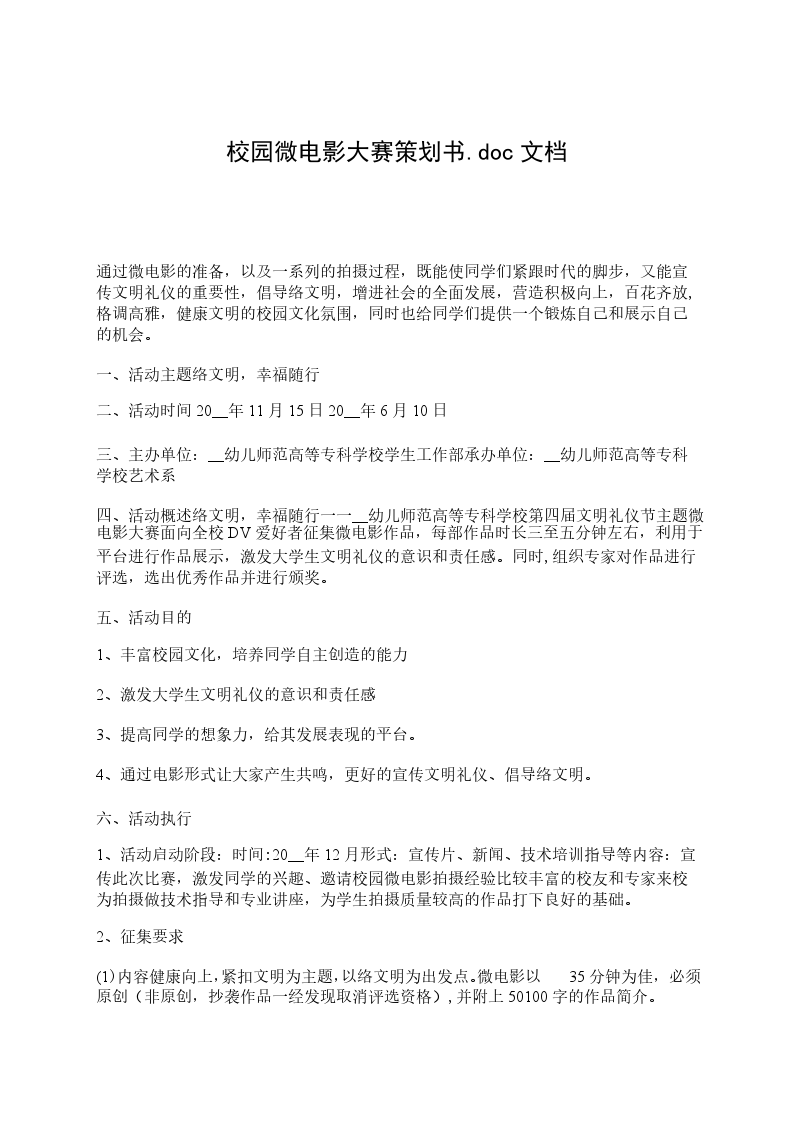 四、活动概述络文明,幸福随行一一__幼儿师范高等专科学校第四届文明礼仪节主题微电影大赛面向全校DV爱好者征集微电影作品,每部作品时长三至五分钟左右,利用于平台进行作品展示,激发大学生文明礼仪的意识和责任感。同时,组织专家对作品进行评选,选出优秀作品并进行颁奖。