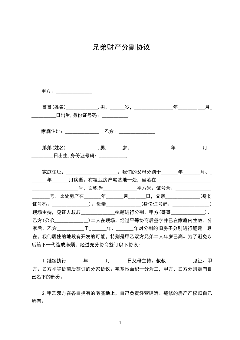 家庭住址:_____________________。我们的父母分别于_______年_______月、_______年_______月病逝。有祖业房产宅基地一处,坐落在__________________________________________号,面积为______________平方米。证号为:______________________号。此处房产在_______年_______月_______日,父亲______________(身份证号码:_______________)、母亲______________(身份证号码:_______________)现场主持,见证人叔叔______________执笔进行分割,甲方(哥哥______________)、乙方(弟弟______________)二人在现场,经过平等协商后签字并已在家庭内生效。分家后,乙方___________于_______年、_______年对分割的旧房子分别进行翻建。现在,我们居住的地段有开发的可能,特别是甲乙双方兄弟二人年岁已高。为了避免以后给下一代造成麻烦,经过充分协商签订以下协议: