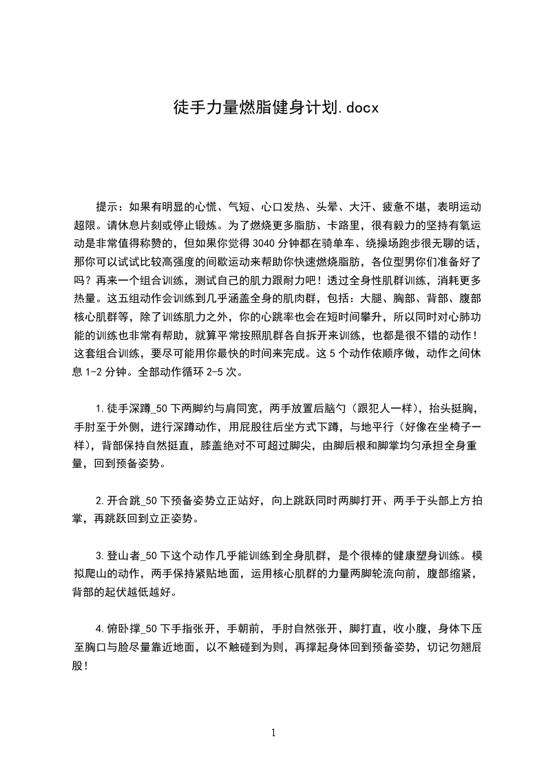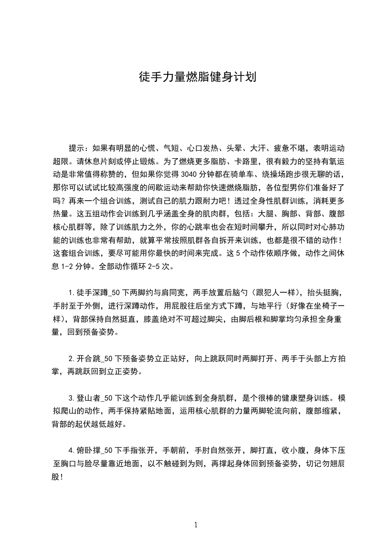 提示:如果有明显的心慌、气短、心口发热、头晕、大汗、疲惫不堪,表明运动超限。请休息片刻或停止锻炼。为了燃烧更多脂肪、卡路里,很有毅力的坚持有氧运动是非常值得称赞的,但如果你觉得3040分钟都在骑单车、绕操场跑步很无聊的话,那你可以试试比较高强度的间歇运动来帮助你快速燃烧脂肪,各位型男你们准备好了吗?再来一个组合训练,测试自己的肌力跟耐力吧!透过全身性肌群训练,消耗更多热量。这五组动作会训练到几乎涵盖全身的肌肉群,包括:大腿、胸部、背部、腹部、核心肌群等,除了训练肌力之外,你的心跳率也会在短时间攀升,所以同时对心肺功能的训练也非常有帮助,就算平常按照肌群各自拆开来训练,也都是很不错的动作!这套组合训练,要尽可能用你最快的时间来完成。这5个动作依顺序做,动作之间休息1-2分钟。全部动作循环2-5次。