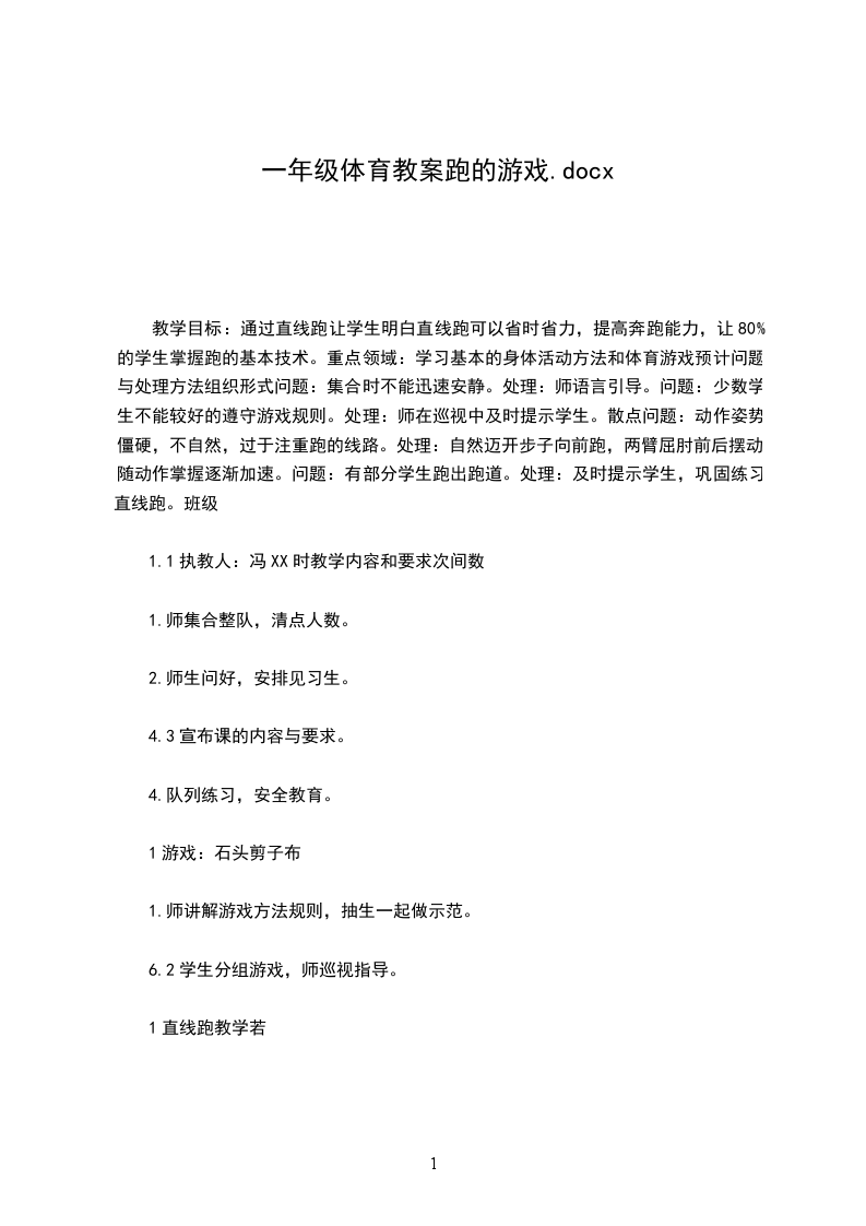 教学目标:通过直线跑让学生明白直线跑可以省时省力,提高奔跑能力,让80%的学生掌握跑的基本技术。重点领域:学习基本的身体活动方法和体育游戏预计问题与处理方法组织形式问题:集合时不能迅速安静。处理:师语言引导。问题:少数学生不能较好的遵守游戏规则。处理:师在巡视中及时提示学生。散点问题:动作姿势僵硬,不自然,过于注重跑的线路。处理:自然迈开步子向前跑,两臂屈肘前后摆动,随动作掌握逐渐加速。问题:有部分学生跑出跑道。处理:及时提示学生,巩固练习直线跑。班级