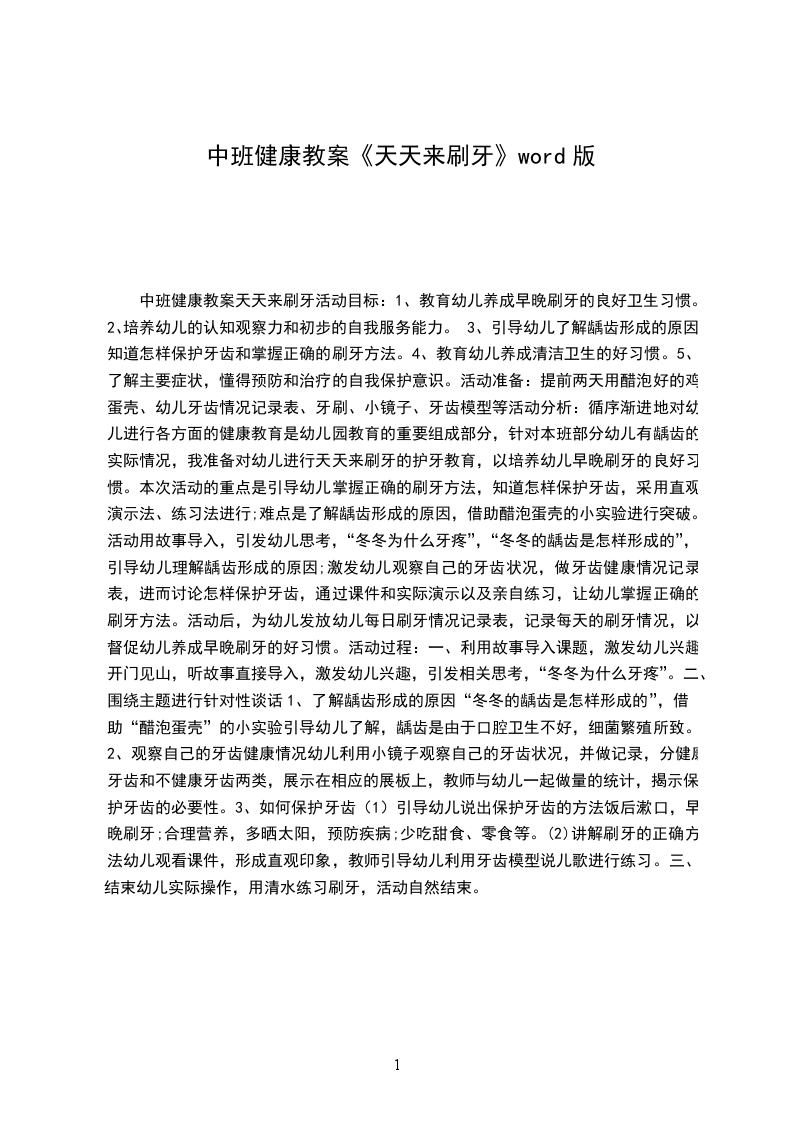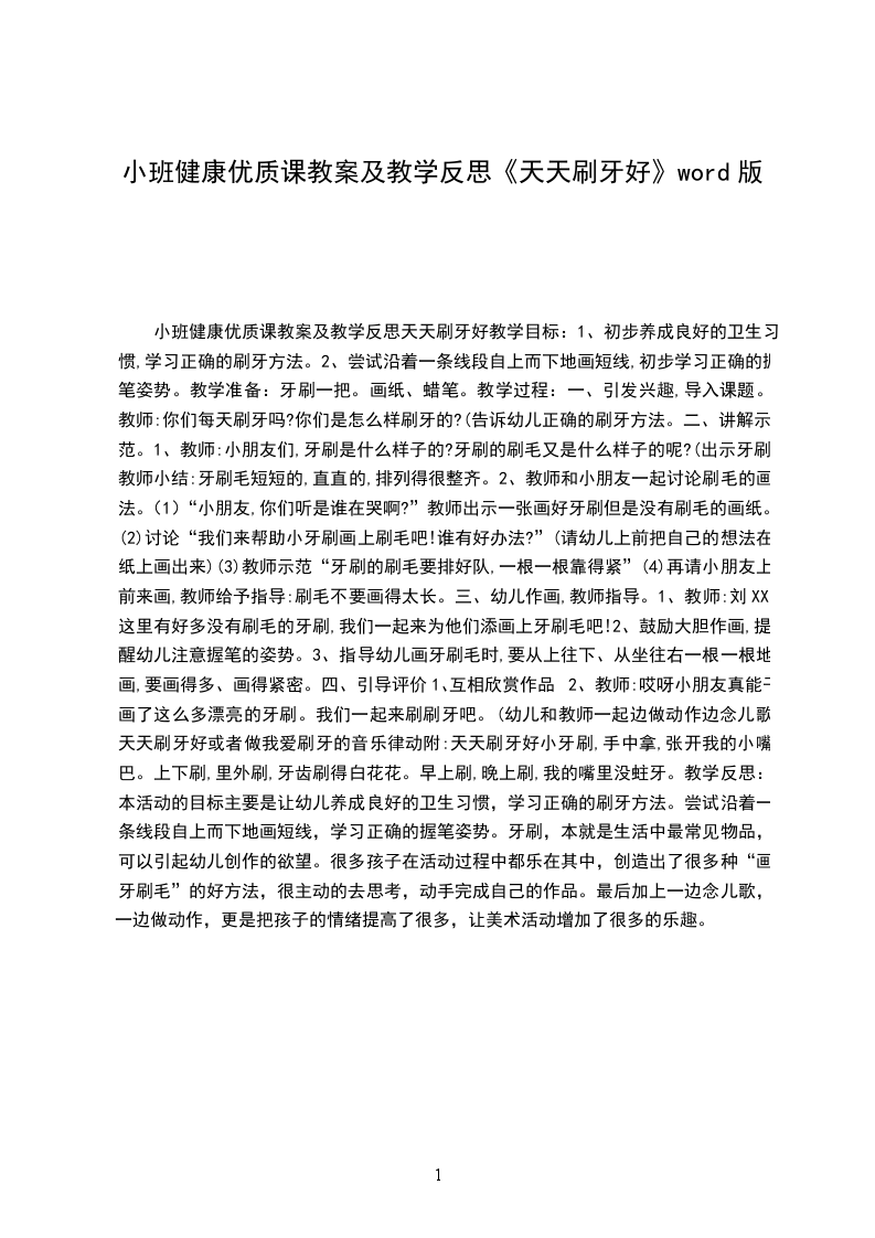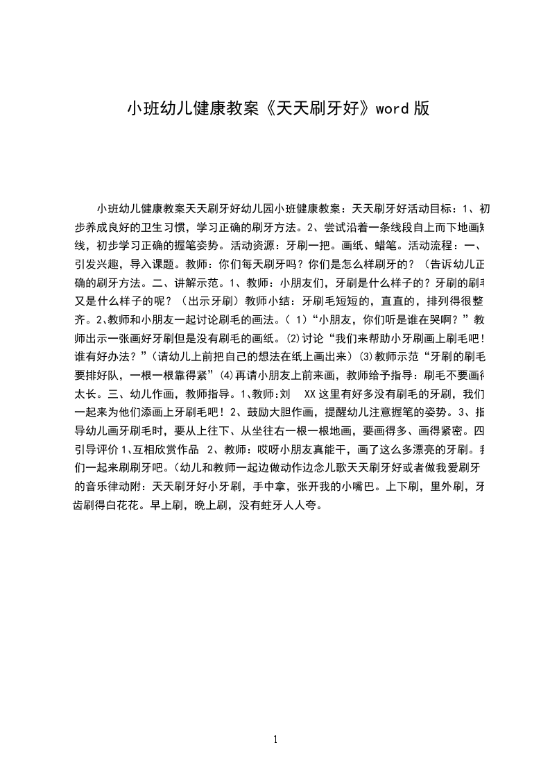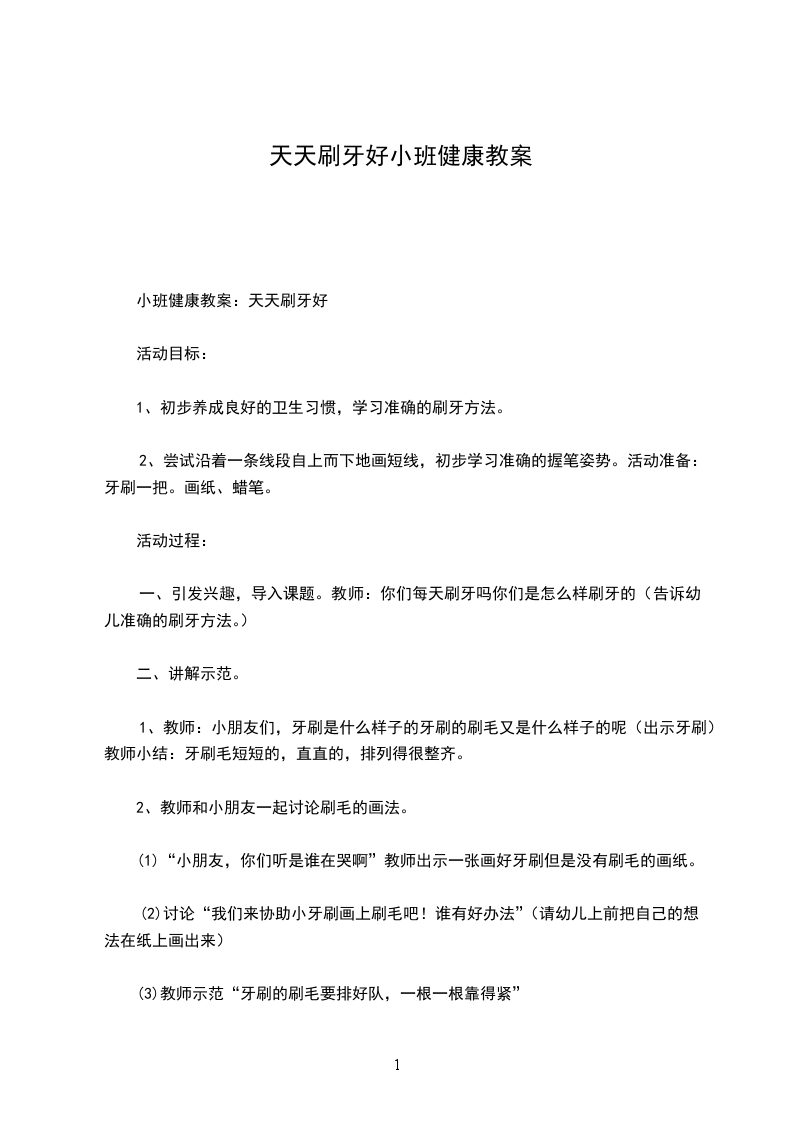 2、教师:哎呀小朋友真能干,画了这么多漂亮的牙刷。我们一起来刷刷牙吧。(幼儿和教师一起边做动作边念儿歌天天刷牙好或者做我爱刷牙的音乐律动附:天天刷牙好小牙刷,手中拿,张开我的小嘴巴。上下刷,里外刷,牙齿刷得白花花。早上刷,晚上刷,没有蛀牙人人夸