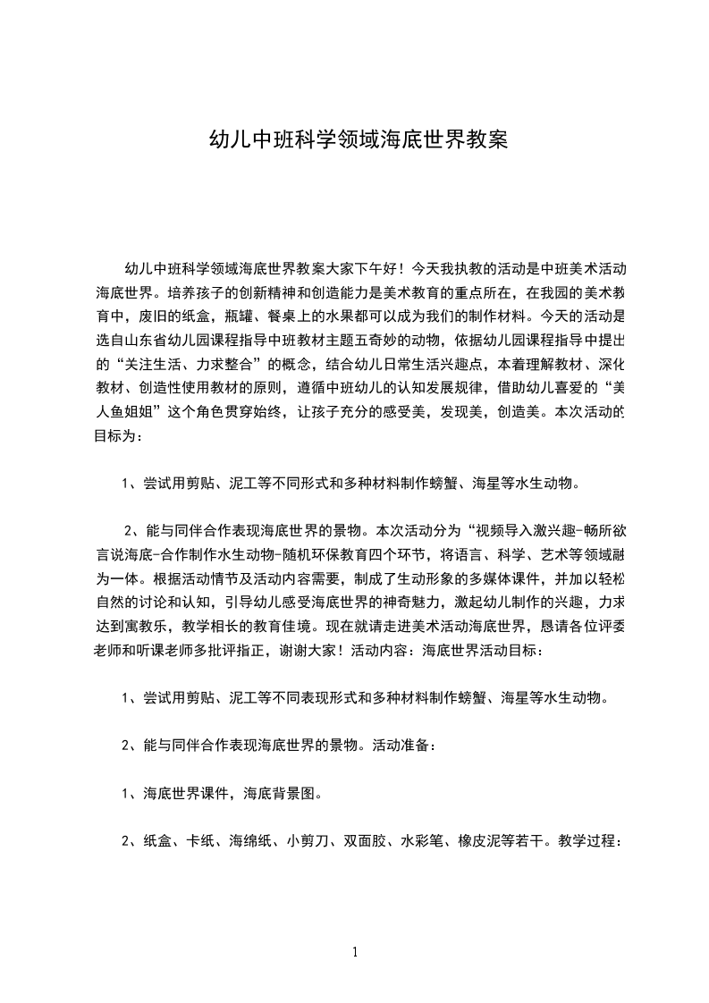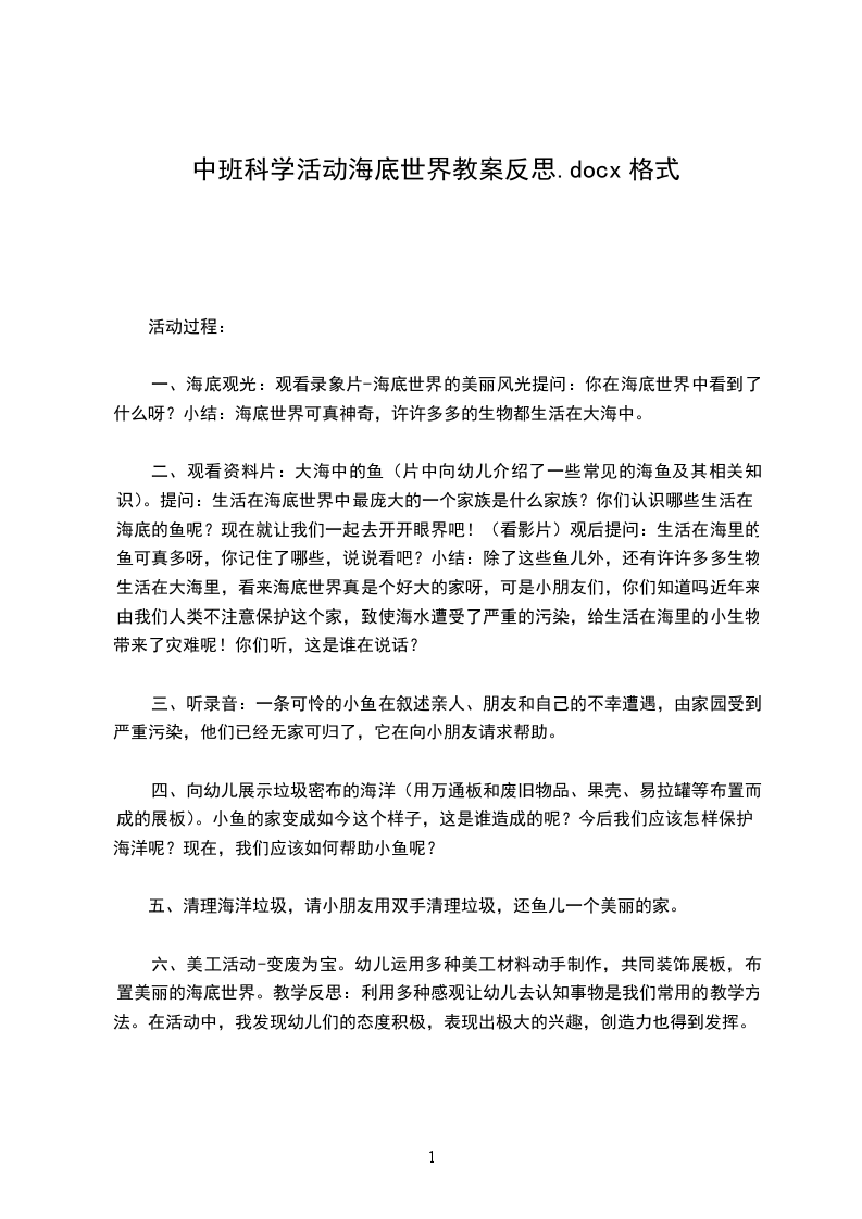 一、海底观光:观看录象片-海底世界的美丽风光提问:你在海底世界中看到了什么呀?小结:海底世界可真神奇,许许多多的生物都生活在大海中。