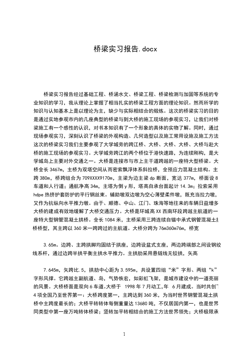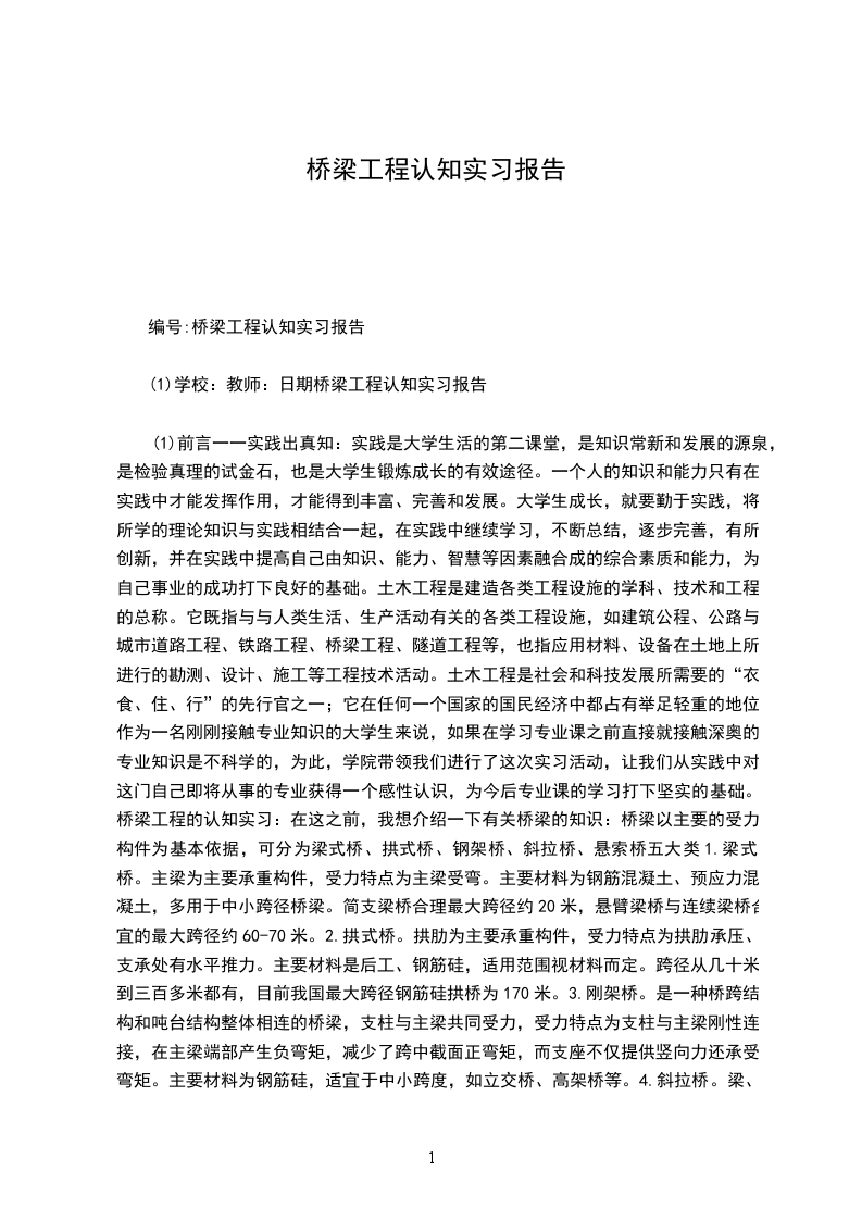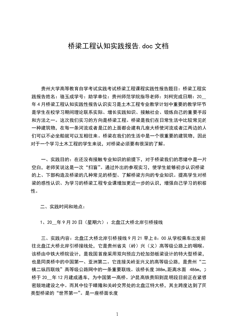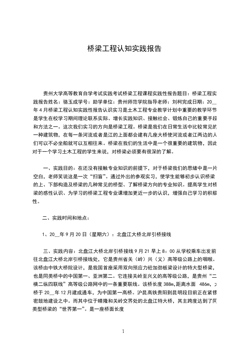 贵州大学高等教育自学考试实践考试桥梁工程课程实践性报告题目:桥梁工程实践报告姓名:骆玉成学号:助学单位:贵州师范学院指导老师:刘柯完成日期:20__年4月桥梁工程认知实践性报告认识实习是土木工程专业教学计划中重要的教学环节,是学生在校学习期间理论联系实际、增长实践知识、接触社会、锻炼自己的重要手段和方法之一。这次我们实习的方向是桥梁工程。桥梁是我们在日常生活中比较常见的一种建筑物,在每一条河流或者是江的上面都会建有几座大桥使河流或者江两边的人们可以不必坐船就可以互相往来。桥梁在我们的生活中是一个很重要的建筑物,因此对于一个学习土木工程的学生来说,对桥梁必须要有很深的了解。
