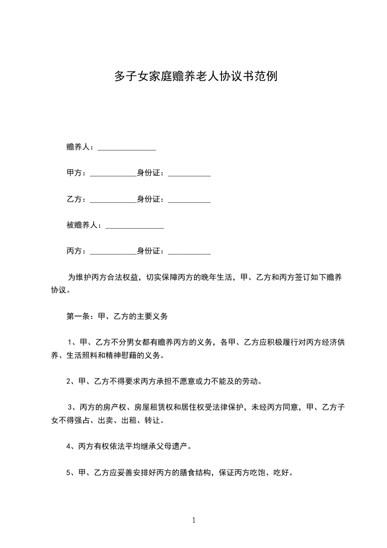 1、甲、乙方不分男女都有赡养丙方的义务,各甲、乙方应积极履行对丙方经济供养、生活照料和精神慰藉的义务。