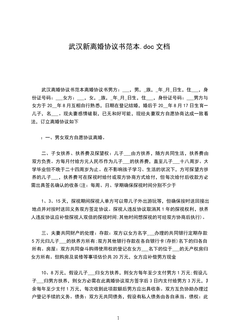 武汉离婚协议书范本离婚协议书男方:___,男,_族,_年_月_日生,住___,身份证号码:___女方:___,女,_族,_年_月_日生,住___,身份证号码:___男方与女方于20__年8月互相自行熟悉,日期在登记结婚,婚后于20__年8月17日生育一儿子,名___。现夫妻感情破裂,已无和好可能,现经夫妻双方自愿协商达成一致看法,订立离婚协议如下