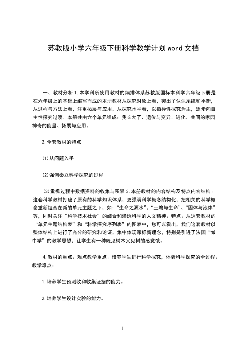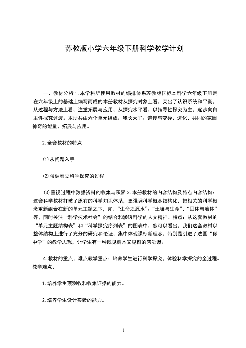 一、教材分析苏教版国标本科学六年级下册突出了认识系统和平衡,从过程与方法上看,注重拓展与应用,从探究水平看,以指导性探究为主,逐步向自主性探究过渡。本册共由六个单元组成:我长大了、遗传与变异、进化、共同的家园、神奇的能量、拓展与应用。