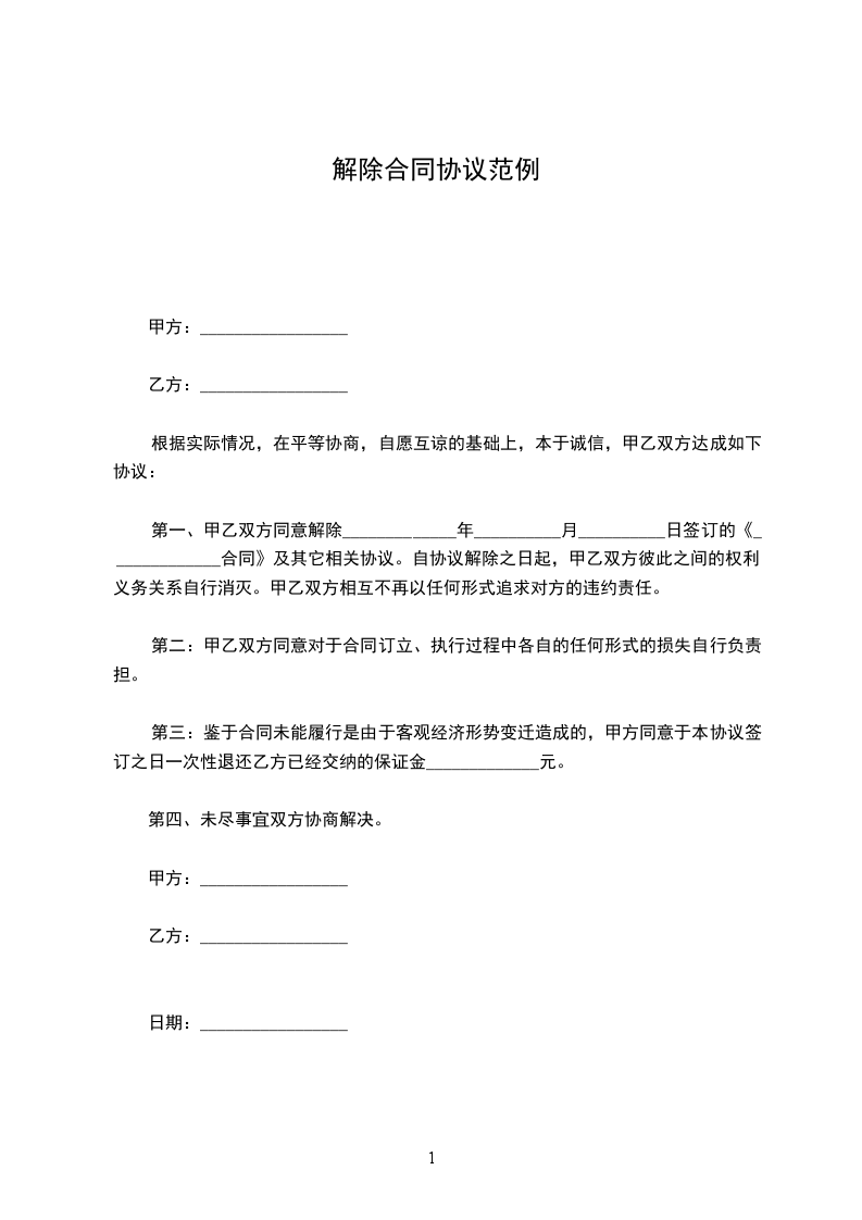 一、甲方同意支付乙方经济补偿金,同时自本协议生效之日起,甲方应于__________年__________月__________日前,支付乙方因甲、乙双方协商一致,解除劳动、保险关系的经济补偿金。