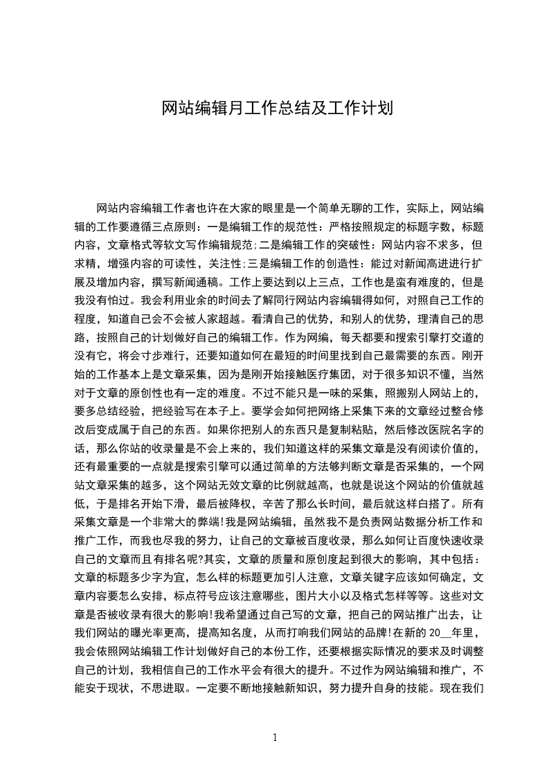 网站编辑10月工作总结与计划担任网站编辑工作三年里,我得到站长的提拔,从一名普通网站兼职推广人员,提升到兼职编辑管理岗位。在此期间,我工作遇到很多疑难问题,也顺利解决了各种问题。同事和领导的帮助是我能顺利完成工作的重要因素之一,从这些人身上,问题能够很快解决,而且学到不少东西。只要每天按照要求,认真地完成本职工作,其实也是一件很轻松愉快的事情!网站内容编辑工作者也许在大家的眼里是一个简单无聊的工作,实际上,网站编辑的工作要遵循三点原则:一是编辑工作的规范性:严格按照规定的标题字数,标题内容,文章格式等软文写作编辑规范;二是编辑工作的突破性:网站内容不求多,但求精,增强内容的可读性,关注性;三是编辑工作的创造性:能过对新闻高进进行扩展及增加内容,撰写新闻通稿。工作上要达到以上三点,工作也是蛮有难度的,但是我没有怕过。我会利用业余的时间去了解同行网站内容编辑得如何,对照自己工作的程度,知道自己会不会被人家超越。看清自己的优势,和别人的优势,理清自己的思路,按照自己的计划做好自己的编辑工作。作为网编,每天都要和搜索引擎打交道的,没有它,将会寸步难行,还要知道如何在最短的时间里找到自己最需要的东西。刚开始的工作基本上是文章采集,因为是刚开始接触医疗集团,对于很多知识不懂,当然对于文章的原创性也有一定的难度。不过不能只是一味的采集,照搬别人网站上的,要多总结经验,把经验写在本子上。要学会如何把网络上采集下来的文章经过整合修改后变成属于自己的东西。如果你把别人的东西只是复制粘贴,然后修改医院名字的话,那么你站的收录量是不会上来的,我们知道这样的采集文章是没有阅读价值的,还有最重要的一点就是搜索引擎可以通过简单的方法够判断文章是否采集的,一个网站文章采集的越多,这个网站无效文章的比例就越高,也就是说这个网站的价值就越低,于是排名开始下滑,最后被降权,辛苦了那么长时间,最后就这样白搭了。所有采集文章是一个非常大的弊端!我是网站编辑,虽然我不是负责网站数据分析工作和推广工作,而我也尽我的努力,让自己的文章被百度收录,那么如何让百度快速收录自己的文章而且有排名呢?其实,文章的质量和原创度起到很大的影响,其中包括:文章的标题多少字为宜,怎么样的标题更加引人注意,文章关键字应该如何确定,文章内容要怎么安排,标点符号应该注意哪些,图片大小以及格式怎样等等。这些对文章是否被收录有很大的影响!我希望通过自己写的文章,把自己的网站推广出去,让我们网站的曝光率更高,提高知名度,从而打响我们网站的品牌在新的20__年里,我会依照网站编辑工作计划做好自己的本份工作,还要根据实际情况的要求及时调整自己的计划,我相信自己的工作水平会有很大的提升。不过作为网站编辑和推广,不能安于现状,不思进取。一定要不断地接触新知识,努力提升自身的技能。现在我们要学的东西是非常之多的,单单从自己工作中学到的知识是很难参透各个技能之间的。所以,对于我的20__年度计划如下: