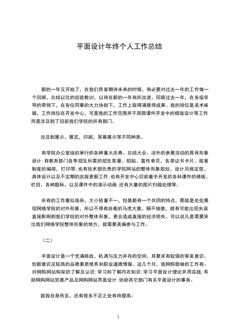 (一)新的一年开始之际,在我们昂首期待未来的时候,有必要对过去一年的工作做一个回顾,总结以往的经验教训,以待在新的一年有所改进。回顾过去一年,在领导的带领下,在各位同事的大力协助下,工作上取得满意得成果。我的岗位是美术编辑,工作岗位在开发中心,可是我的工作范围并不局限程序开发中的模版设计等工作,而是涉及到了编辑部的广告设计,广告图片替换,页面策划修改;涉及到技术部页面制作,代码调试,样式修改,后期维护等不同工作。可以说凡是需要突出我们网络部及网站整体形象的地方,就需要美编参与工作。设计工作是痛苦与快乐的炼狱,每当面临重大的设计任务时充满了压力,开始搜集各种资料(包括文字的、图片的),接下来寻找设计灵感,沉思、焦灼,经过痛苦煎熬,终有了满意的创意时倍感轻松。每当经过艰苦的磨砺,自己的劳动成果得到大家的肯定时,便是工作中的快乐!充满了快意。当然,工作中的痛苦与快乐首先要求有坚定的政治信念与立场,遵纪守法,爱岗敬业的强烈责任感和事业心。因为热爱自己的工作,所以精通本岗位的专业识和业务技能,熟悉有关行业规范,关注行业的发展趋势。时刻保持强烈的创新意识。严格纪律预示着杰出的成绩,遵守公司制度,坚守工作岗位,以极高的工作热情主动全身心地投入到自己的工作当中去,不骄不躁,积极配合开发。很好的理解自己工作,出色的履行了岗位职责,能够高质、高效的完成本职工作。