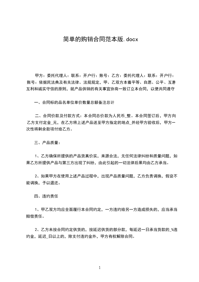 甲方:委托代理人:联系:开户行:账号:乙方:委托代理人:联系:开户行:账号:依据民法典及有关法律、法规规定,甲、乙双方本着平等、自愿、公平、互惠互利和诚实守信的原则,就产品供销的有关事宜协商一致订立本合同,以便共同遵守。