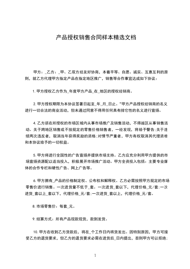 1.甲方授权乙方作为_年度甲方产品_在_地区的授权经销商。