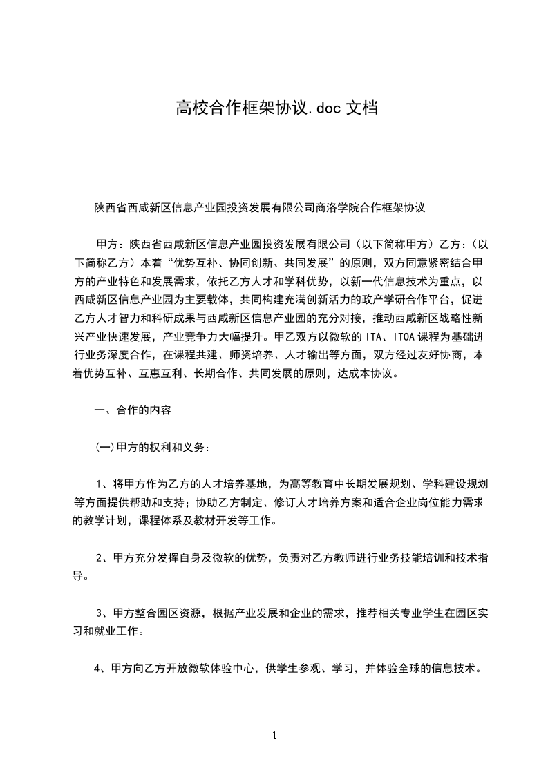 甲方:陕西省西咸新区信息产业园投资发展有限公司(以下简称甲方)乙方:(以下简称乙方)本着“优势互补、协同创新、共同发展”的原则,双方同意紧密结合甲方的产业特色和发展需求,依托乙方人才和学科优势,以新一代信息技术为重点,以西咸新区信息产业园为主要载体,共同构建充满创新活力的政产学研合作平台,促进乙方人才智力和科研成果与西咸新区信息产业园的充分对接,推动西咸新区战略性新兴产业快速发展,产业竞争力大幅提升。甲乙双方以微软的ITA、ITOA课程为基础进行业务深度合作,在课程共建、师资培养、人才输出等方面,双方经过友好协商,本着优势互补、互惠互利、长期合作、共同发展的原则,达成本协议。