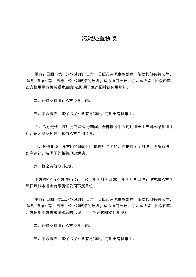 甲方:日照市第一污水处理厂乙方:日照市污泥生物处理厂依据其他有关法律、法规,遵循平等、自愿、公平和诚信的原则,双方协商一致,订立本协议。协议内容:乙方使用甲方机械脱水后的污泥,用于生产园林绿化用肥料。