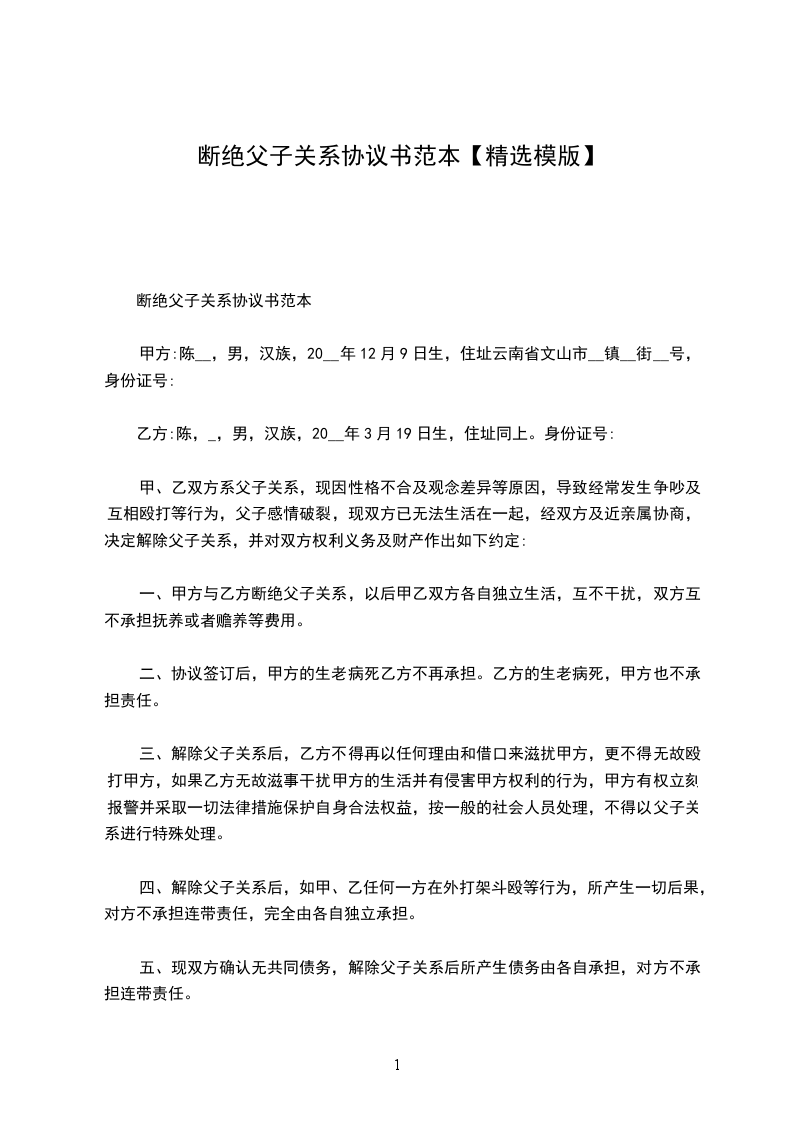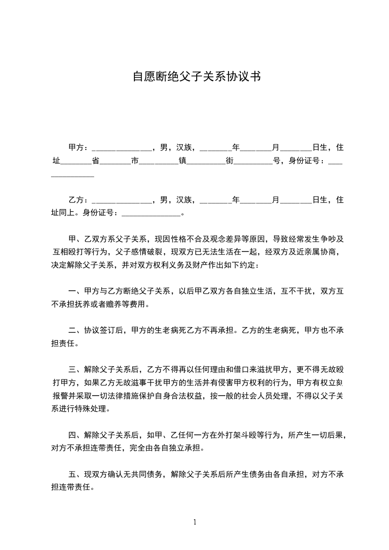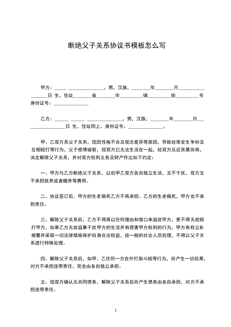 一、甲方与乙方断绝父子关系,以后甲乙双方各自独立生活,互不干扰,双方互不承担抚养或者赡养等费用。