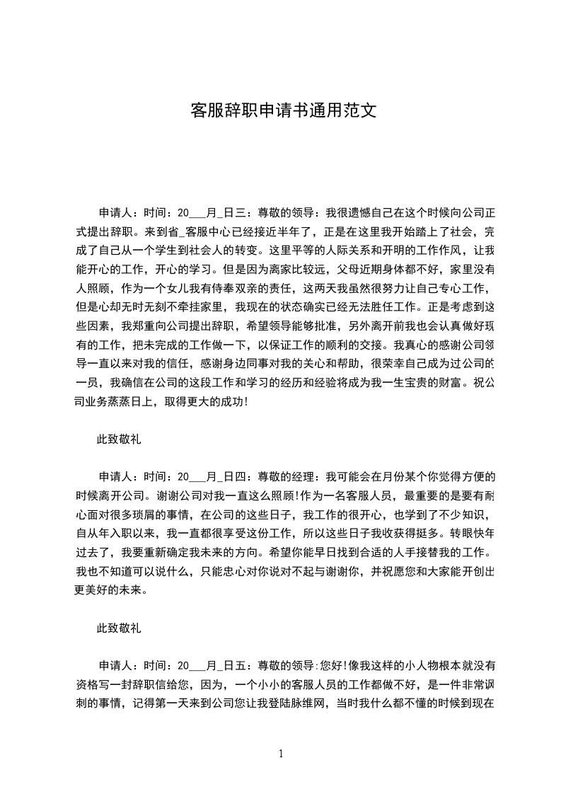 申请人:时间:20___月_日四:尊敬的经理:我可能会在月份某个你觉得方便的时候离开公司。谢谢公司对我一直这么照顾!作为一名客服人员,最重要的是要有耐心面对很多琐屑的事情,在公司的这些日子,我工作的很开心,也学到了不少知识,自从年入职以来,我一直都很享受这份工作,所以这些日子我收获得挺多。转眼快年过去了,我要重新确定我未来的方向。希望你能早日找到合适的人手接替我的工作。我也不知道可以说什么,只能忠心对你说对不起与谢谢你,并祝愿您和大家能开创出更美好的未来。