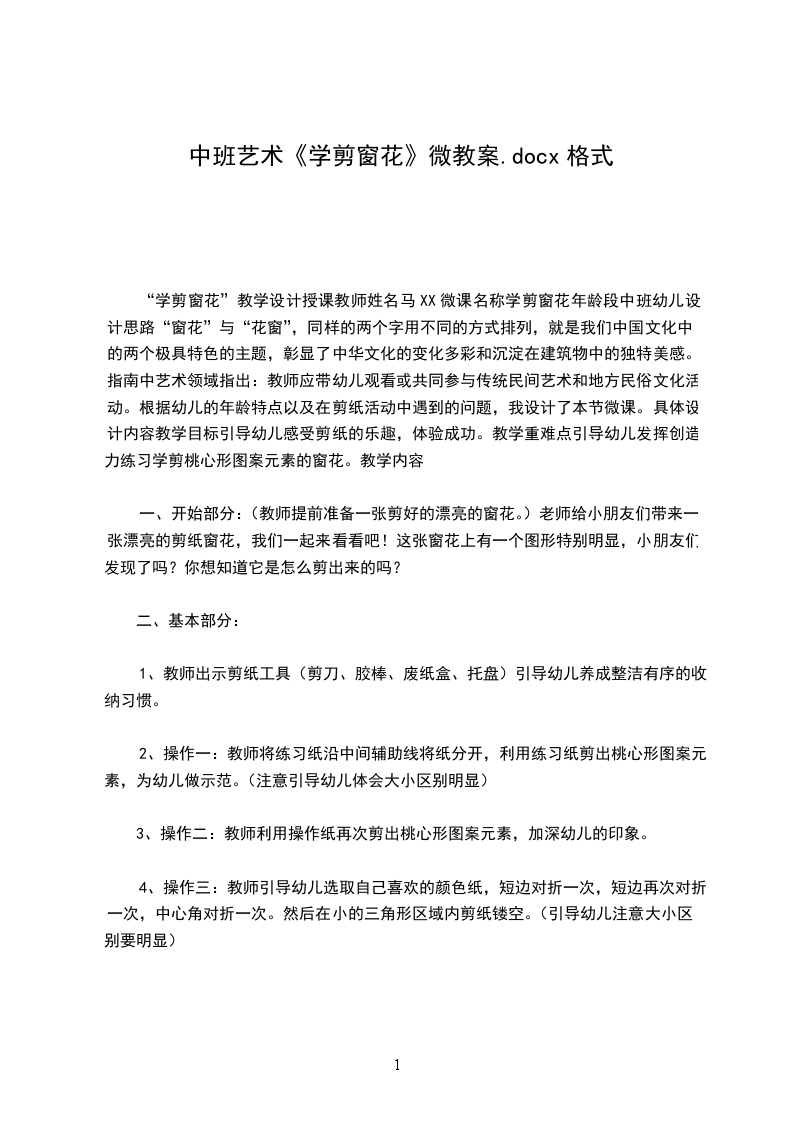 “学剪窗花”教学设计授课教师姓名马XX微课名称学剪窗花年龄段中班幼儿设计思路“窗花”与“花窗”,同样的两个字用不同的方式排列,就是我们中国文化中的两个极具特色的主题,彰显了中华文化的变化多彩和沉淀在建筑物中的独特美感。指南中艺术领域指出:教师应带幼儿观看或共同参与传统民间艺术和地方民俗文化活动。根据幼儿的年龄特点以及在剪纸活动中遇到的问题,我设计了本节微课。具体设计内容教学目标引导幼儿感受剪纸的乐趣,体验成功。教学重难点引导幼儿发挥创造力练习学剪桃心形图案元素的窗花。教学内容
