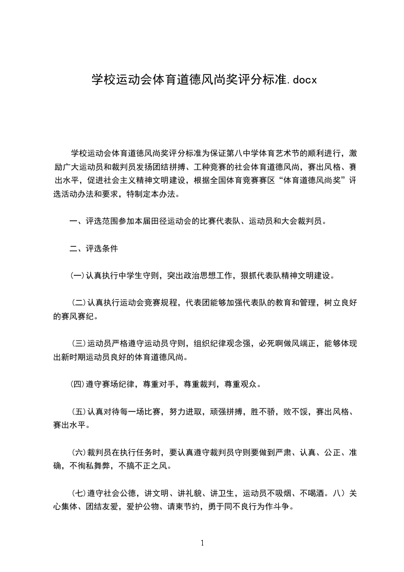 学校运动会体育道徳风尚奖评分标准为保证第八中学体育艺术节的顺利进行,激励广大运动员和裁判员发扬团结拼搏、工种竞赛的社会体育道德风尚,赛出风格、赛出水平,促进社会主义精神文明建设,根据全国体育竞赛赛区“体育道德风尚奖”评选活动办法和要求,特制定本办法。