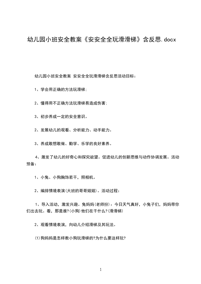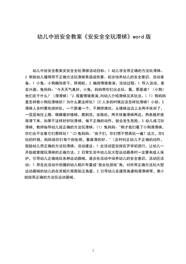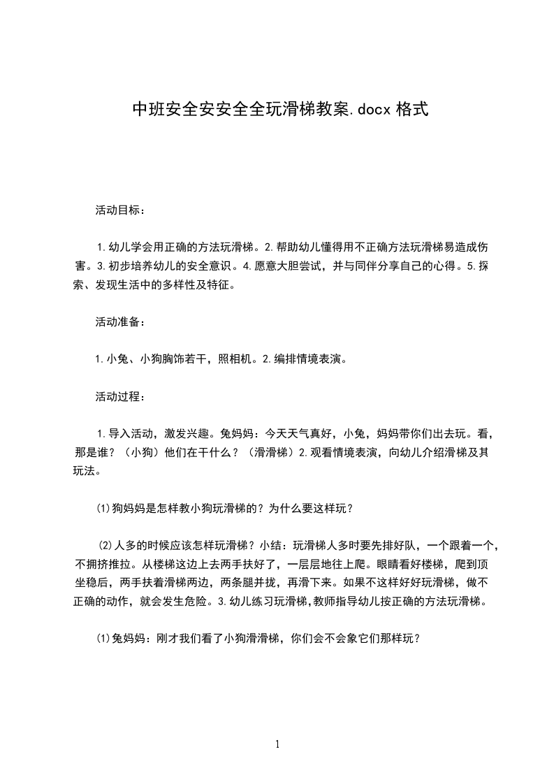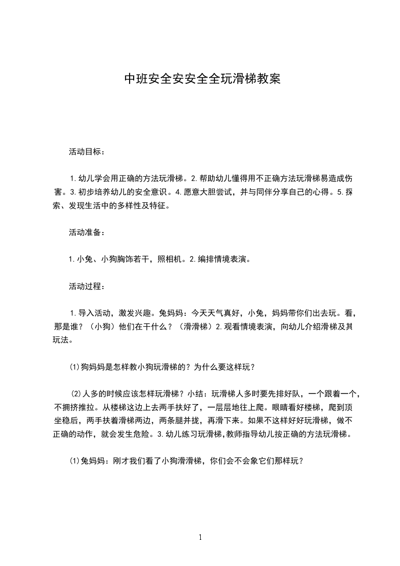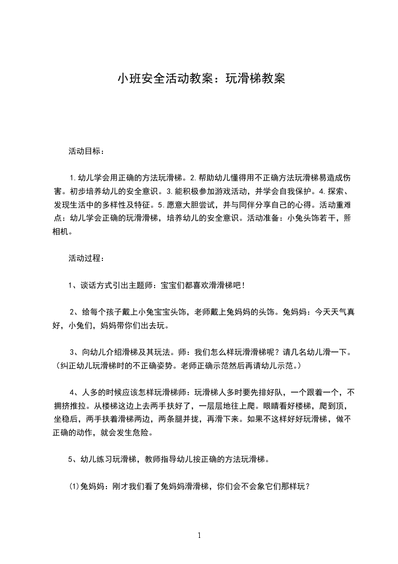 (2)人多的时候应该怎样玩滑梯?小结:玩滑梯人多时要先排好队,一个跟着一个,不拥挤推拉。从楼梯这边上去两手扶好了,一层层地往上爬。眼睛看好楼梯,爬到顶,坐稳后,两手扶着滑梯两边,两条腿并拢,再滑下来。如果不这样好好玩滑梯,做不正确的动作,就会发生危险。3.幼儿练习玩滑梯,教师指导幼儿按正确的方法玩滑梯。
