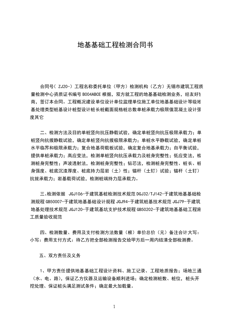 合同号(ZJ20-)工程名称委托单位(甲方)检测机构(乙方)无锡市建筑工程质量检测中心资质证书编号B004ABCE根据,双方就工程的地基基础检测业务,经友好协商,签订本合同。工程概况建设单位设计单位监理单位施工单位地基基础设计等级地基处理类型桩基设计桩型设计桩长桩截面规格桩总数单桩承载力极限值混凝土设计强度其它