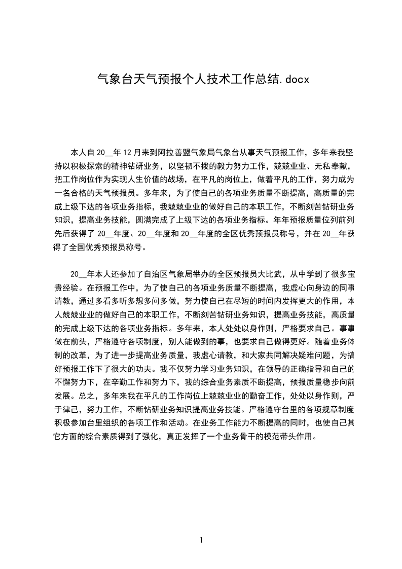本人自20__年12月来到阿拉善盟气象局气象台从事天气预报工作,多年来我坚持以积极探索的精神钻研业务,以坚韧不拨的毅力努力工作,兢兢业业、无私奉献,把工作岗位作为实现人生价值的战场,在平凡的岗位上,做着平凡的工作,努力成为一名合格的天气预报员。多年来,为了使自己的各项业务质量不断提高,高质量的完成上级下达的各项业务指标,我兢兢业业的做好自己的本职工作,不断刻苦钻研业务知识,提高业务技能,圆满完成了上级下达的各项业务指标。年年预报质量位列前列。先后获得了20__年度、20__年度和20__年度的全区优秀预报员称号,并在20__年获得了全国优秀预报员称号。