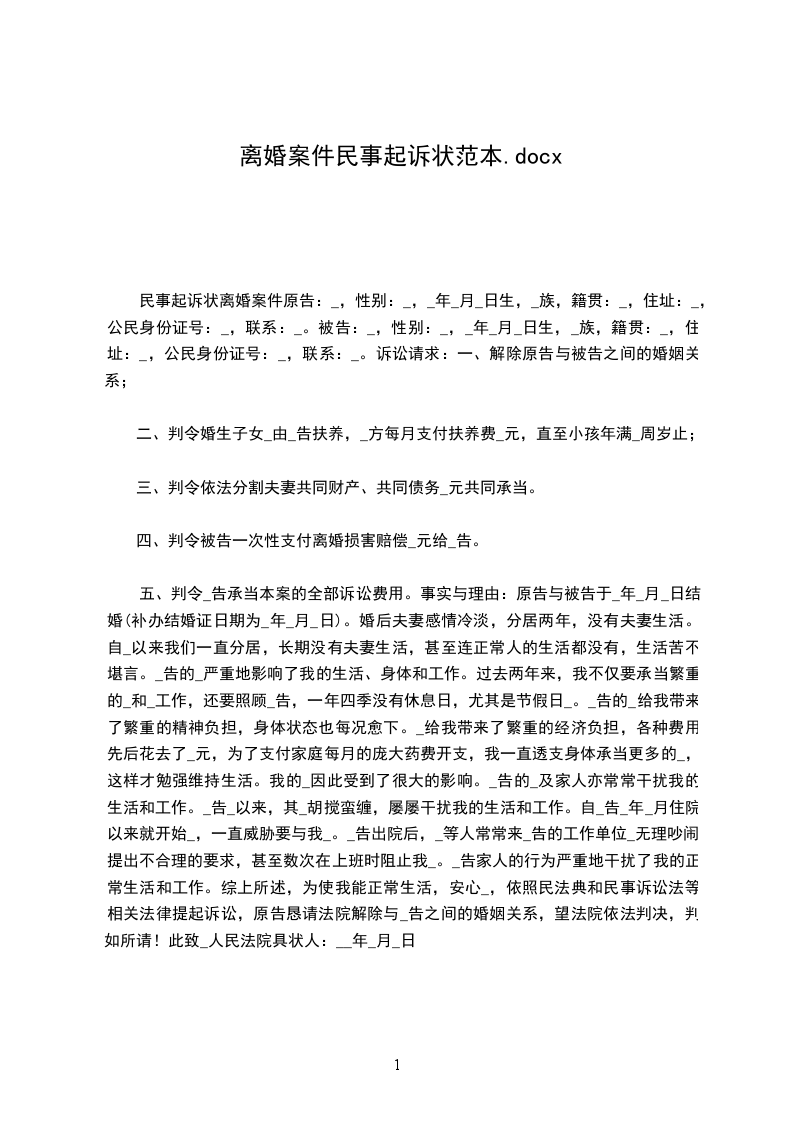 民事起诉状离婚案件原告:_,性别:_,_年_月_日生,_族,籍贯:_,住址:_,公民身份证号:_,联系:_。被告:_,性别:_,_年_月_日生,_族,籍贯:_,住址:_,公民身份证号:_,联系:_。诉讼请求:一、解除原告与被告之间的婚姻关系;