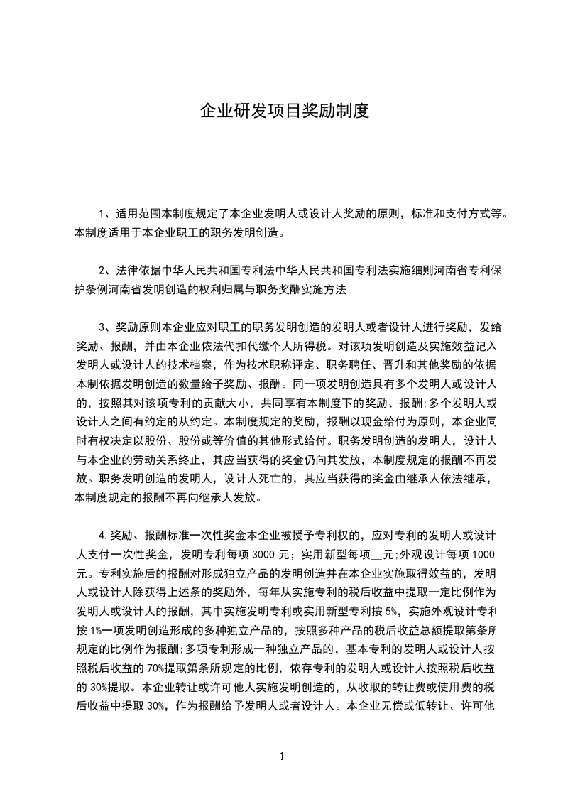 3、奖励原则本企业应对职工的职务发明创造的发明人或者设计人进行奖励,发给奖励、报酬,并由本企业依法代扣代缴个人所得税。对该项发明创造及实施效益记入发明人或设计人的技术档案,作为技术职称评定、职务聘任、晋升和其他奖励的依据。本制依据发明创造的数量给予奖励、报酬。同一项发明创造具有多个发明人或设计人的,按照其对该项专利的贡献大小,共同享有本制度下的奖励、报酬;多个发明人或设计人之间有约定的从约定。本制度规定的奖励,报酬以现金给付为原则,本企业同时有权决定以股份、股份或等价值的其他形式给付。职务发明创造的发明人,设计人与本企业的劳动关系终止,其应当获得的奖金仍向其发放,本制度规定的报酬不再发放。职务发明创造的发明人,设计人死亡的,其应当获得的奖金由继承人依法继承,本制度规定的报酬不再向继承人发放。