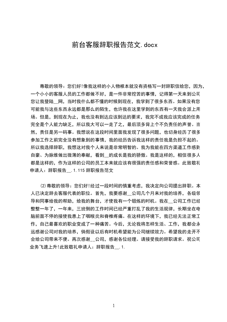 (2)尊敬的领导:您们好!经过一段时间的慎重考虑,我决定向公司提出辞职。本人已决定辞去客服代表的职位。首先,我要感谢__公司几个月来对我的培养,各级领导和同事给我的帮助,给我的舞台,才使我有一个锻炼的时机。我在__公司工作已经整整一年了,一年来,三班倒的工作时间已经严重打乱了我的生活规律,长期坐在电脑前面不停的接使我患上了咽喉炎和脊椎疼痛。在这样的环境下,我已经无法正常工作,自己最喜欢的职业变成了一种痛苦。今后,无论我将怎样生活、工作,我都会永远感谢公司对我的培养,倘假设以后有时机希望能为公司继续效力。希望我的走开不会给公司带来不便。再次感谢__公司,感谢各位经理。请接受我的辞职请求。祝公司业务飞速上升!此致敬礼申请人:辞职报告__.1.