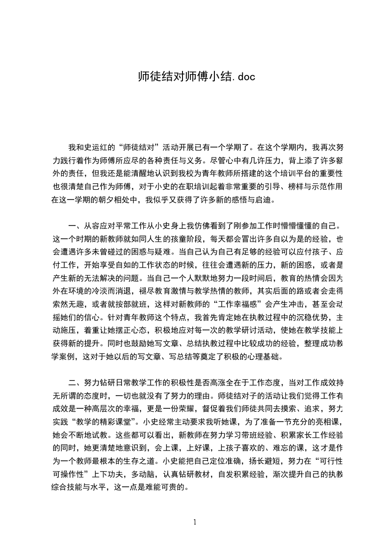三、勇于挑战薄弱环节一个学期的“师徒结对”,它让我意识到自身的诸多不足。“学然后知不足,教然后知困”,其实在师傅这“名”与“实”之间还是存在较大差距的,但既然接受“教与导”的重任,就只能努力缩小学科差距,减缓自己的教学盲点了。在提高徒弟业务水平的同时,我也逐日努力充实自己,勇于向自己的薄弱面进行自我挑战,试图日积月累的教学反思、总结提炼、自我完善中逐步凝聚自己的教学特色,然后才能用“一桶之水中去舀取一瓢之水”,施与他人的同时亦获得自我发展与自我提升。相信在以后的师徒结对活动中,我有更多的理论与实践相结合的实战经验与身体力行的直接榜样作用来影响徒弟小史,说教的力度也会更强,指导的深度与广度亦能得到进一步的深掘与拓宽。